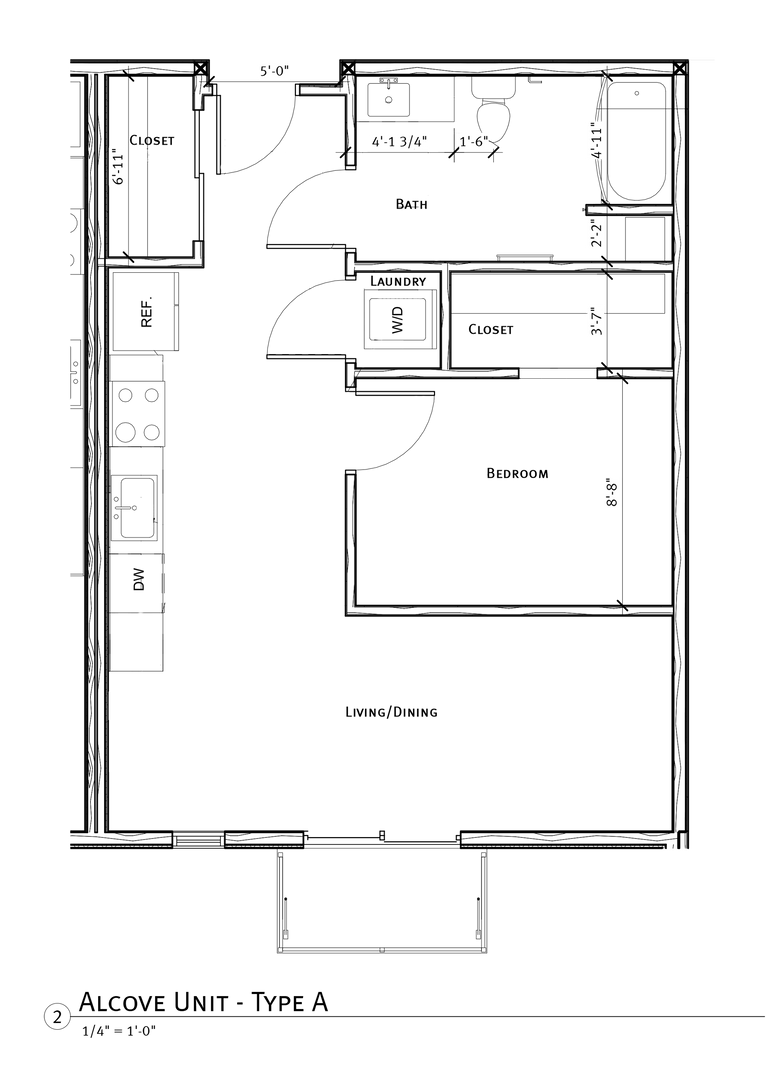 This Alcove Unit shares natural light between the living area and bedroom via a transom wall or partial wall design. This 1-bedroom apartment includes a modern kitchen with energy efficient, stainless-steel appliances, quartz countertops, ample storage, luxury vinyl tile flooring throughout, modern fixtures, stackable in-unit washer and dryer, window coverings, ceiling fans, large closet, and high-speed internet. The Alcove Units also features a bathtub with rainfall showerhead, oversized windows, 9-foot ceilings and 10-foot balcony on select units.
