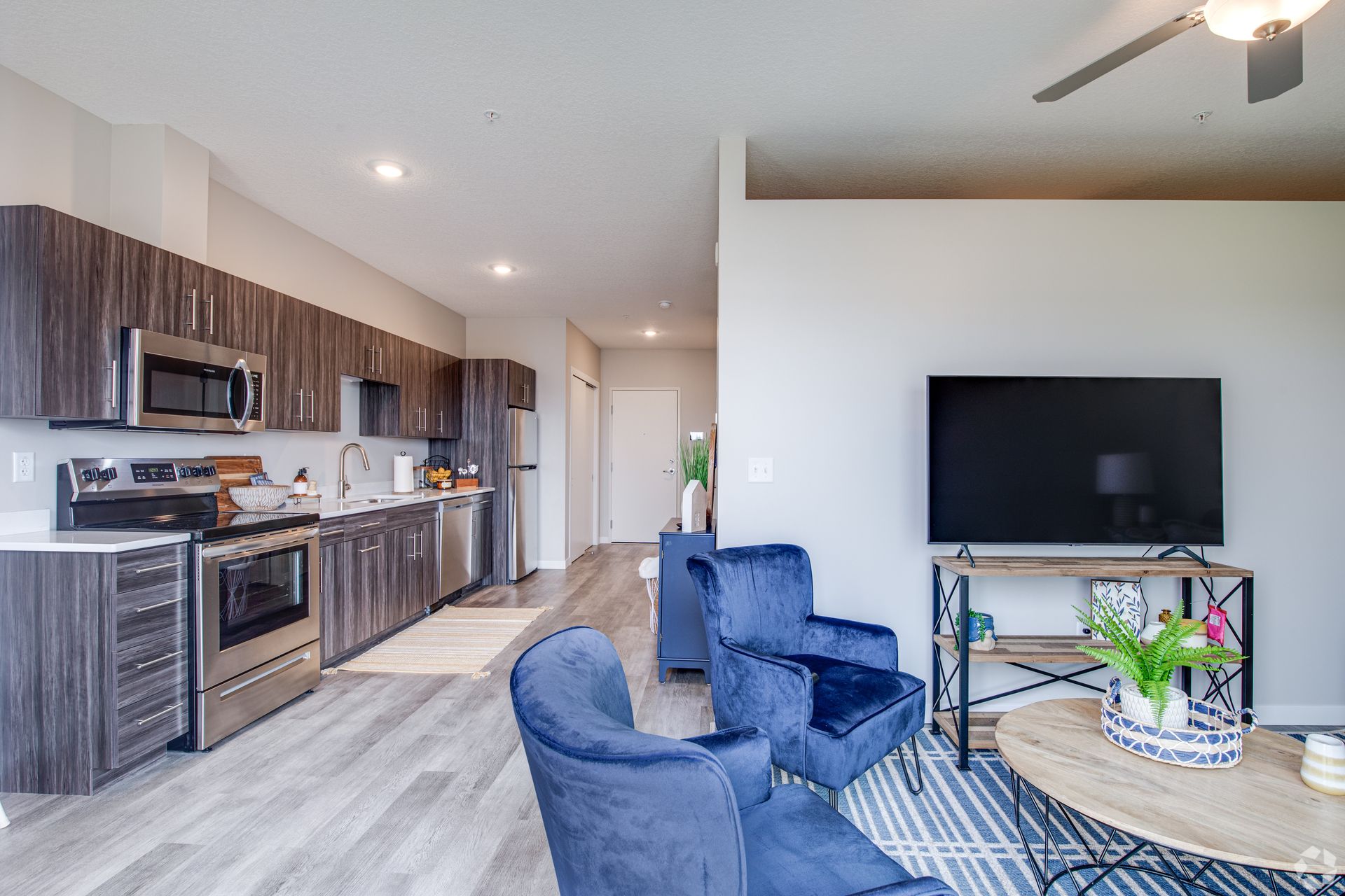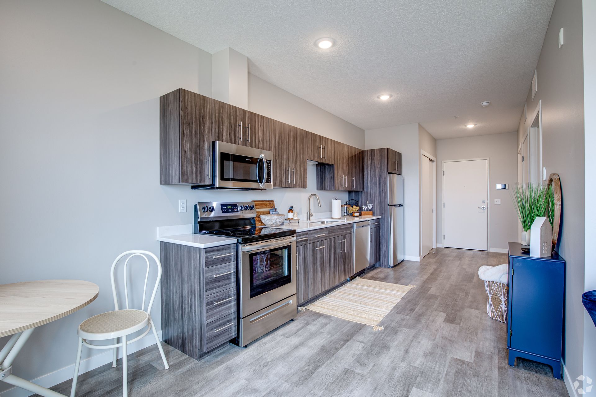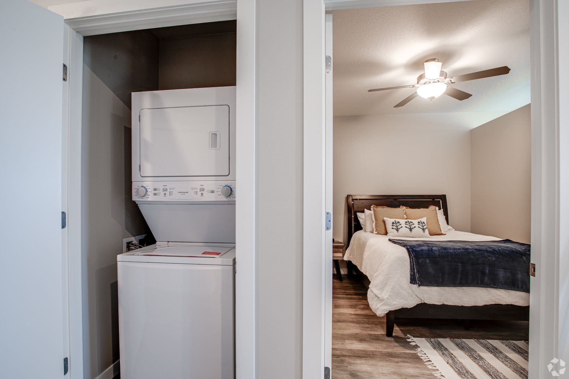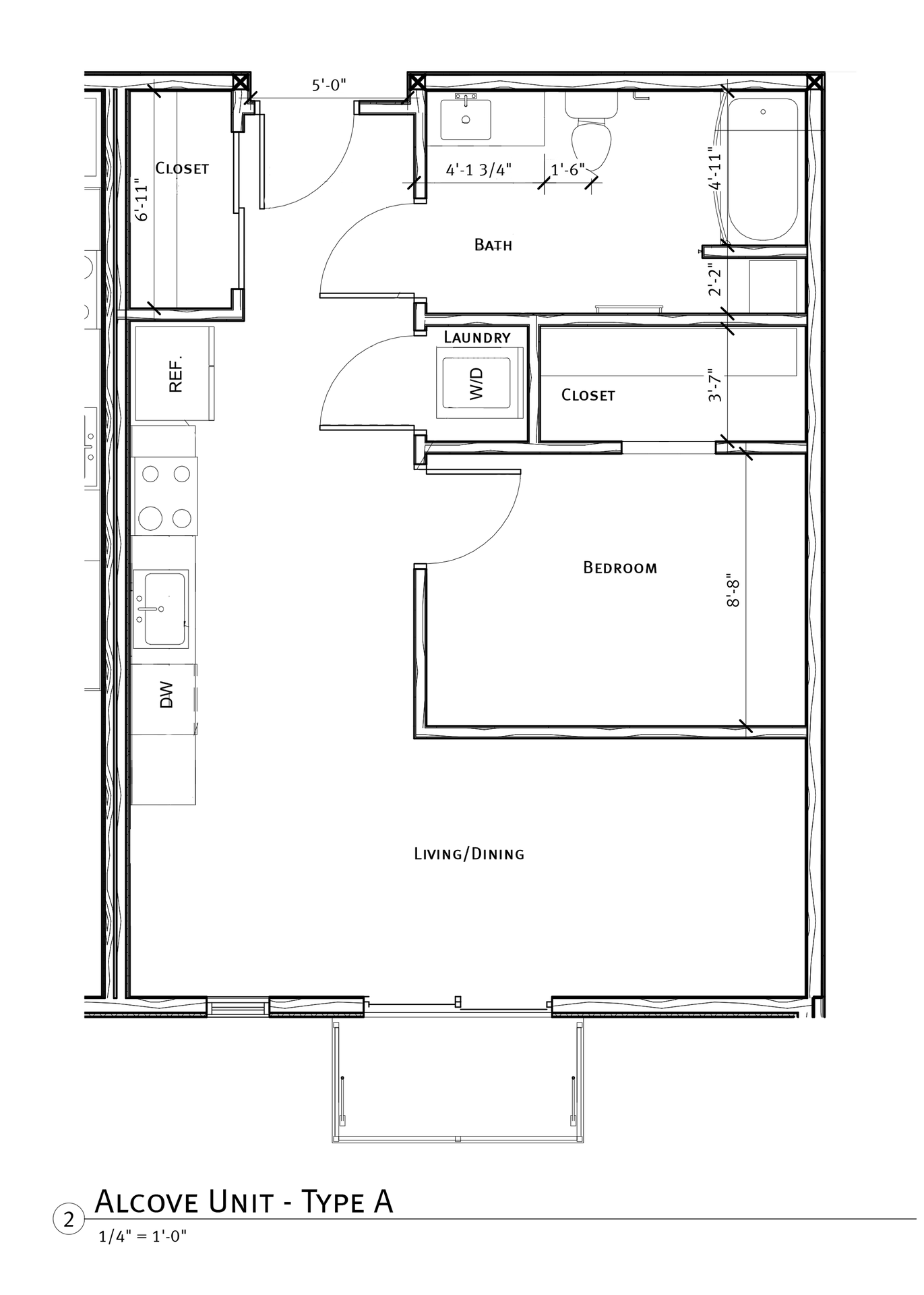 This Alcove Unit shares natural light between the living area and bedroom via a transom wall or partial wall design. This 1-bedroom apartment includes a modern kitchen with energy efficient, stainless-steel appliances, quartz countertops, ample storage, luxury vinyl tile flooring throughout, modern fixtures, stackable in-unit washer and dryer, window coverings, ceiling fans, large closet, and high-speed internet. The Alcove Units also features a bathtub with rainfall showerhead, oversized windows, 9-foot ceilings and 10-foot balcony on select units.