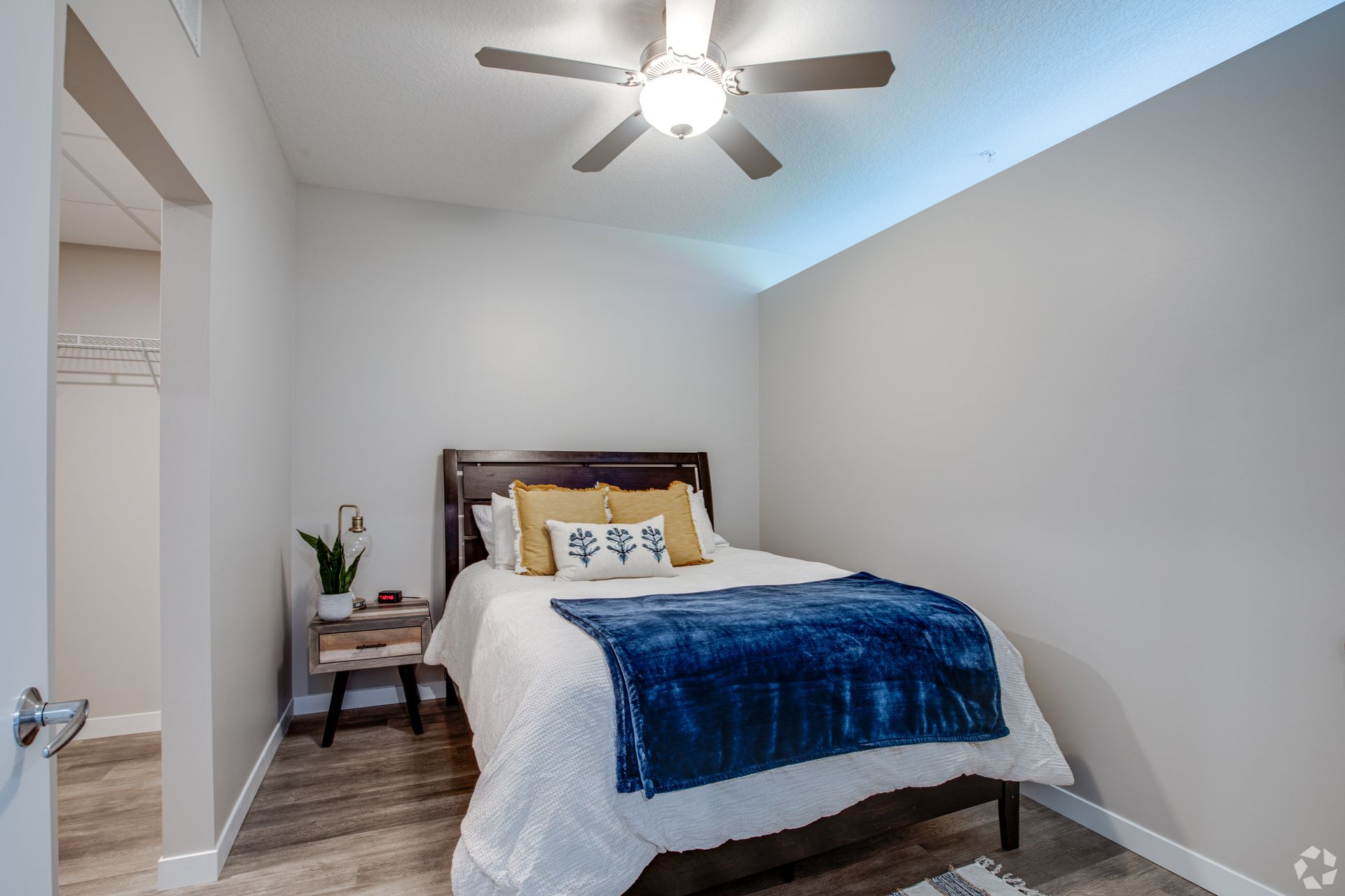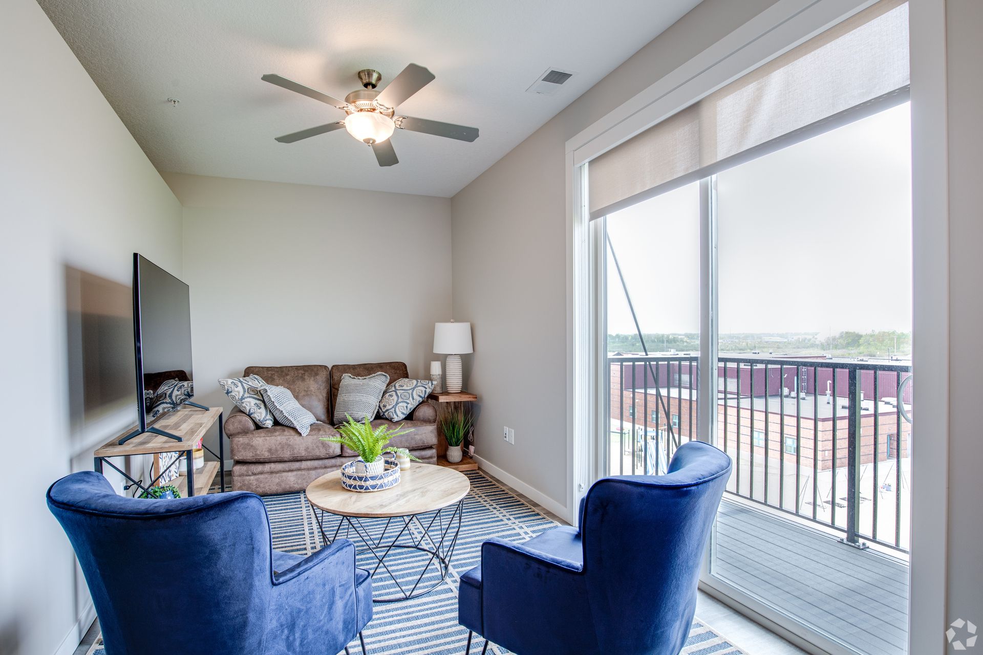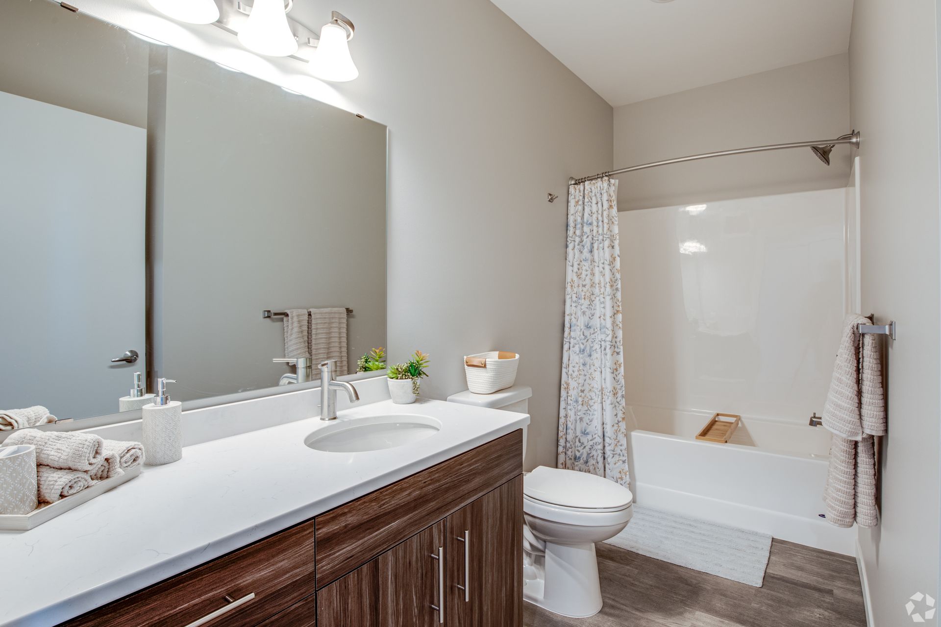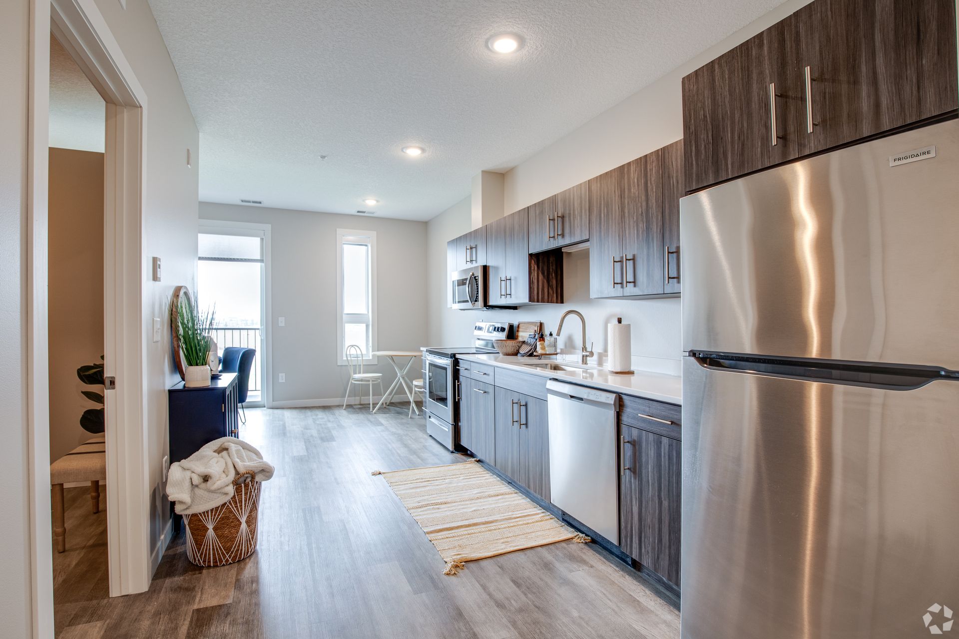 This Alcove Unit shares natural light between the living area and bedroom via a transom wall or partial wall design. This 1-bedroom apartment includes a modern kitchen with energy efficient, stainless-steel appliances, quartz countertops, ample storage, luxury vinyl tile flooring throughout, modern fixtures, stackable in-unit washer and dryer, window coverings, ceiling fans, large closet, and high-speed internet. The Alcove Units also features a bathtub with rainfall showerhead, oversized windows, 9-foot ceilings and 10-foot balcony on select units.