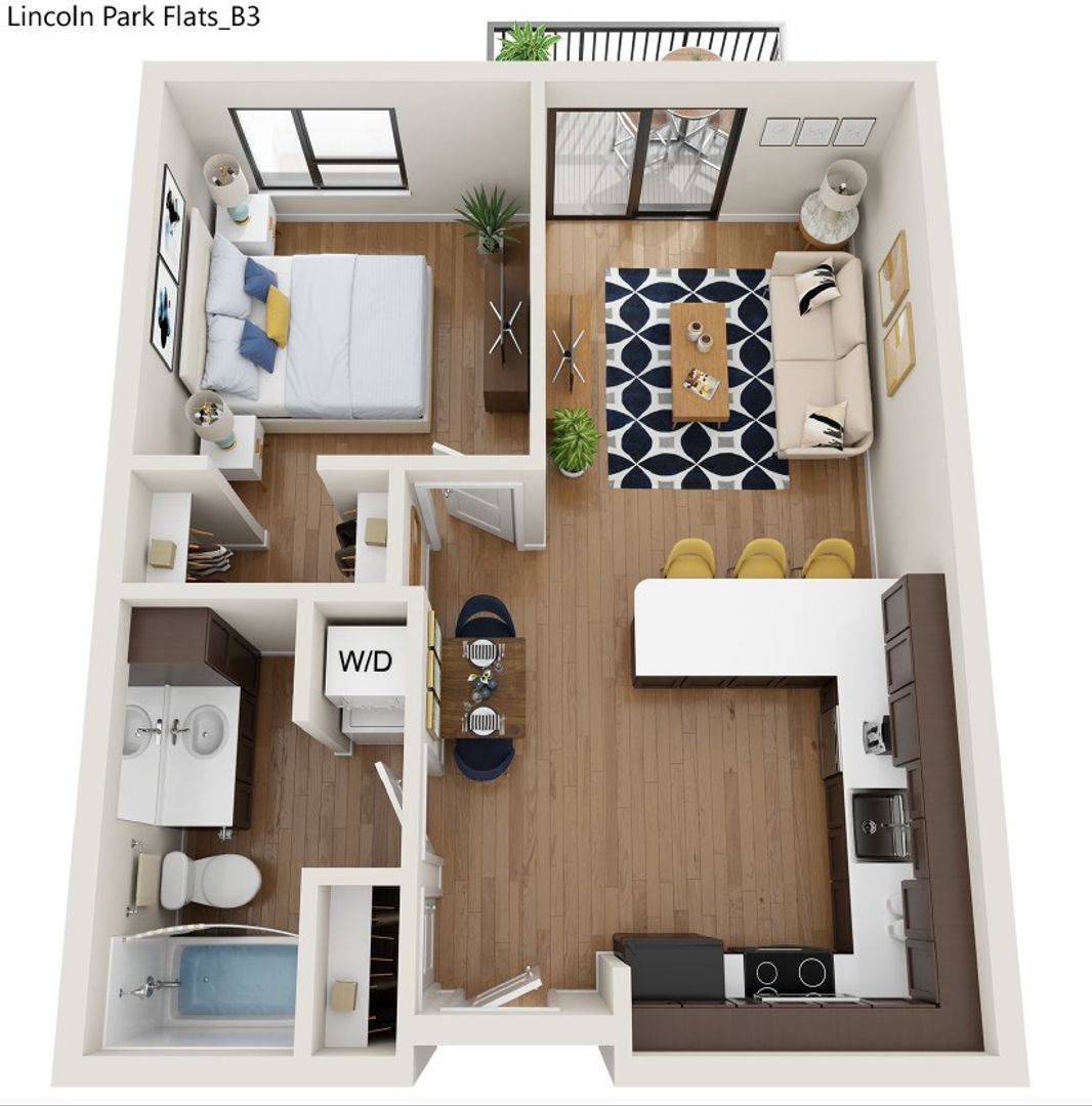 The 1-bedroom, 1-bathroom units at Lincoln Park Flats include modern kitchens with energy efficient stainless-steel appliances, quartz countertops, ample storage space, laminate wood flooring throughout, modern fixtures, stackable washer and dryer, window coverings, ceiling fans, large closets, and a private outdoor balcony.
