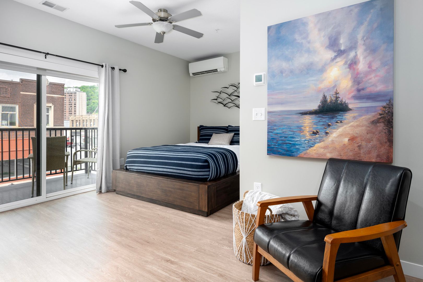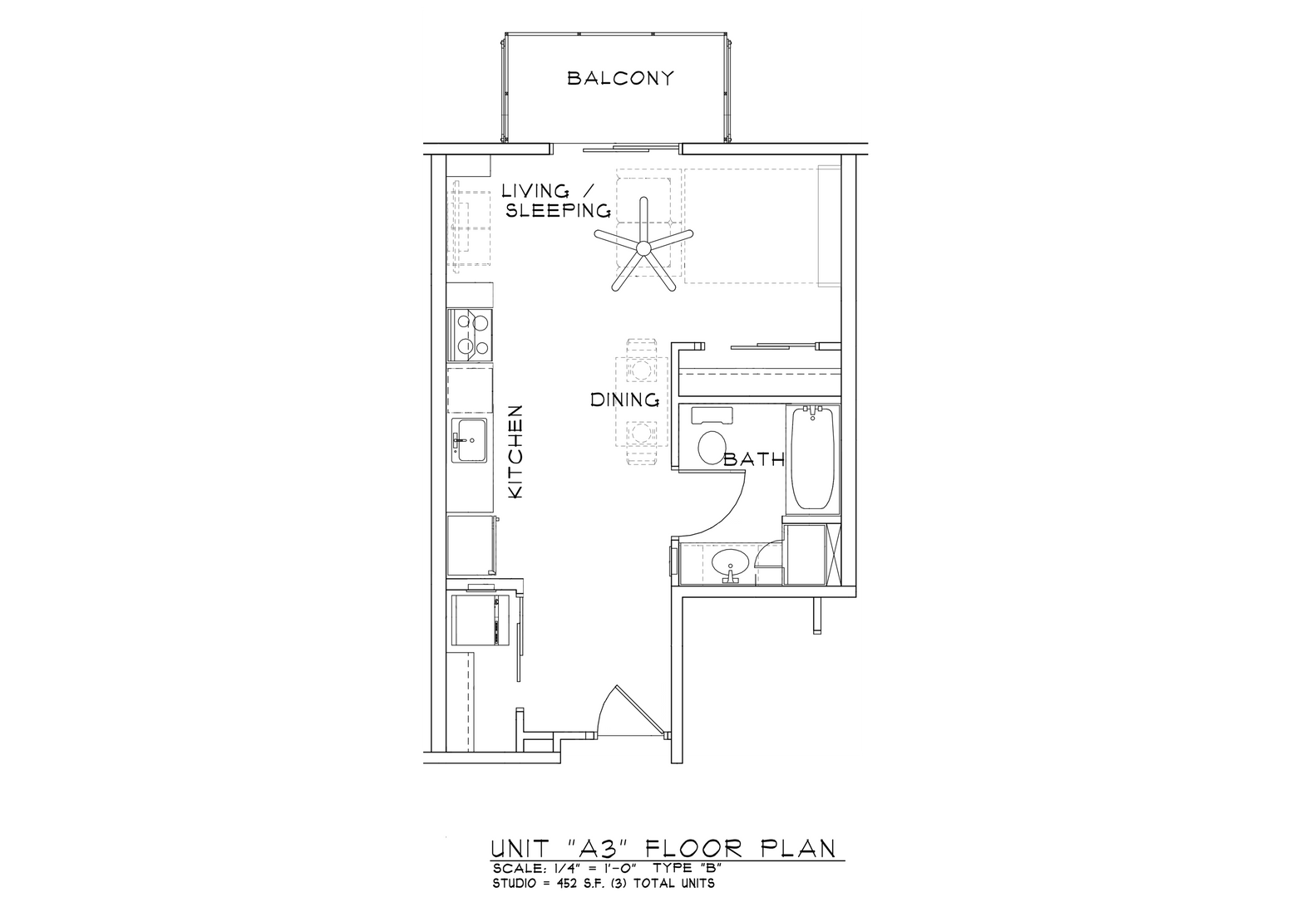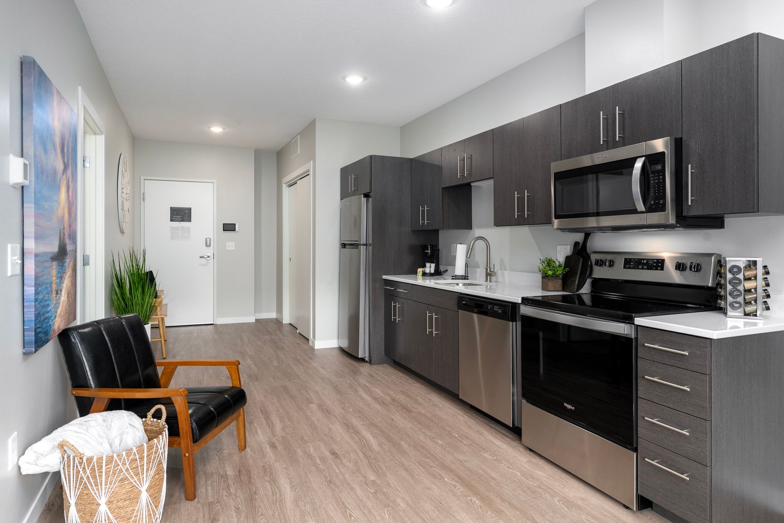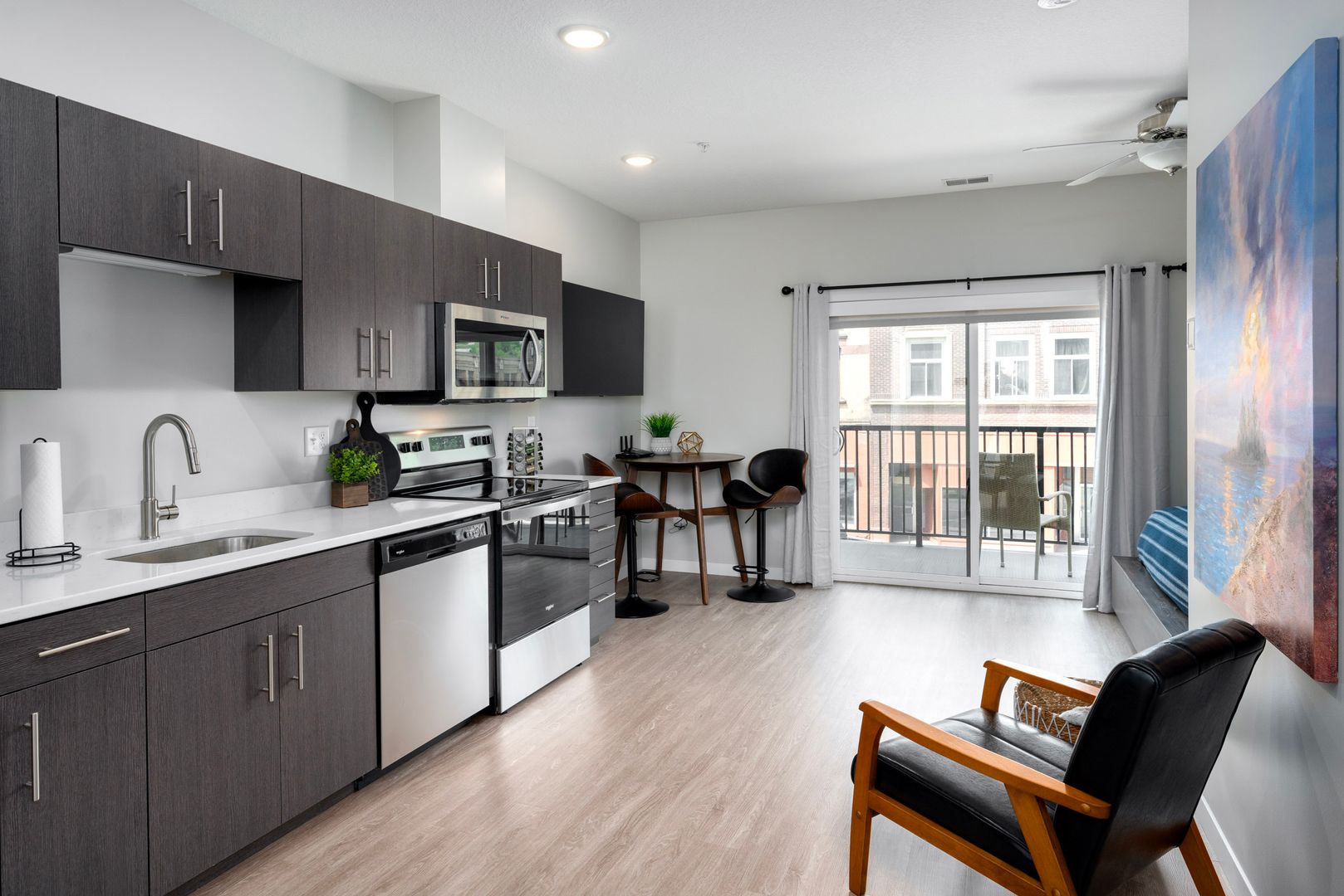 The Unit S.1-S.3 are studio apartments with modern kitchen, energy efficient, stainless-steel appliances, quartz countertops, large closet, laminate wood flooring throughout, modern fixtures, stackable in-unit washer and dryer, window covering, ceiling fan.