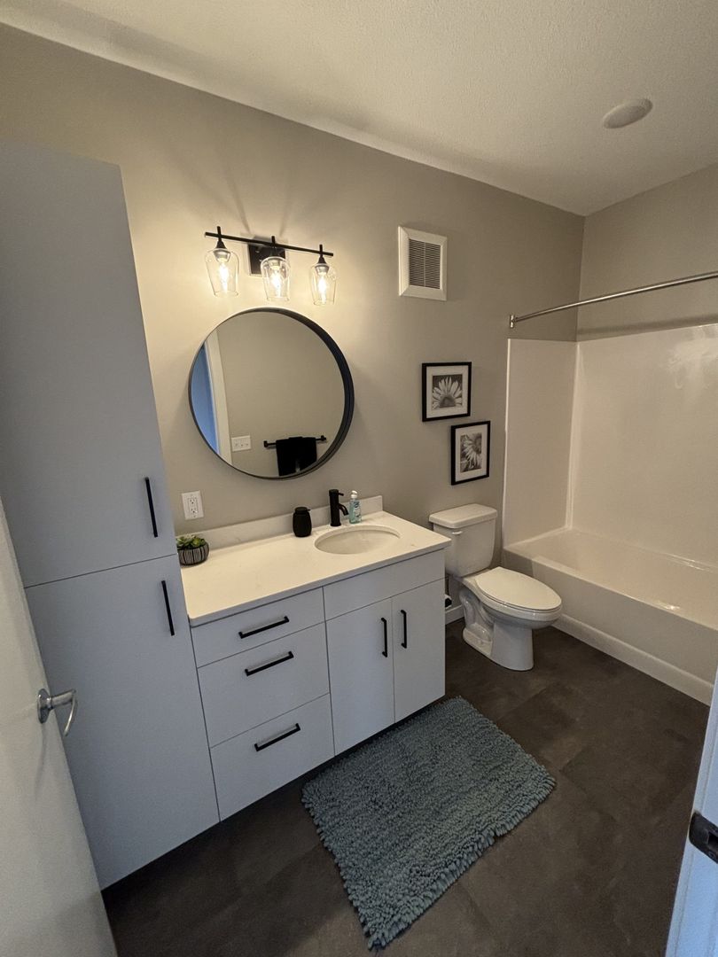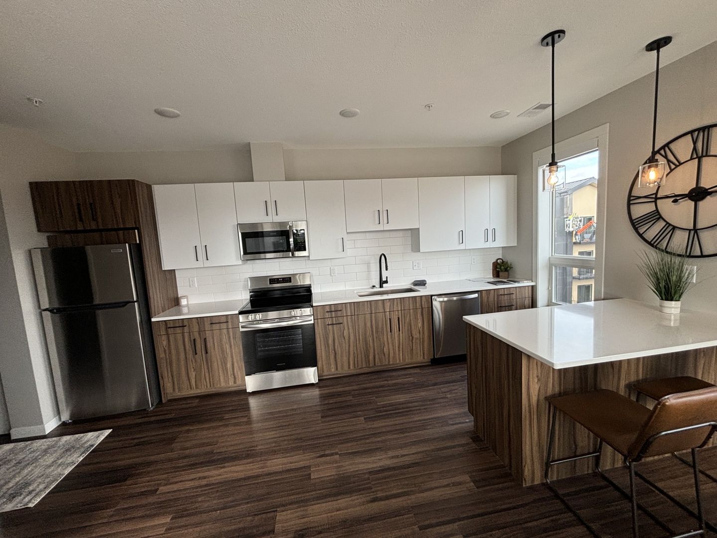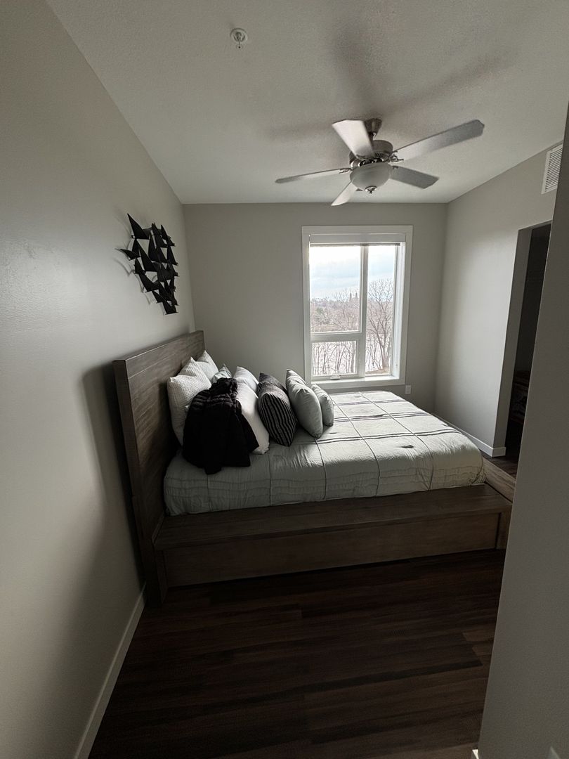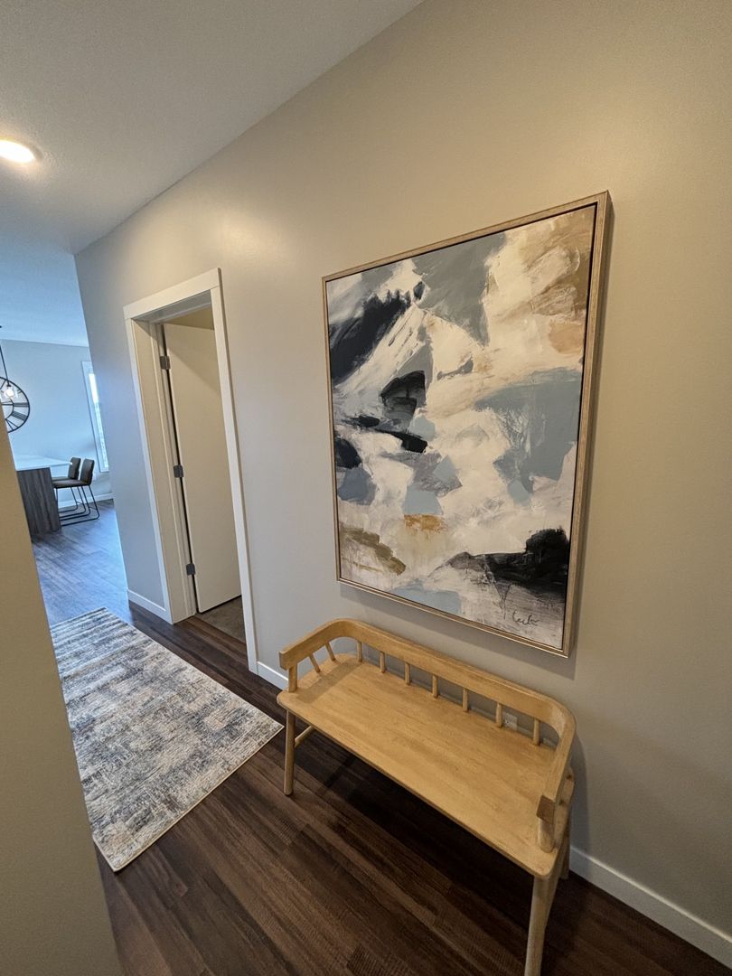 This one-bedroom apartment boasts a modern eat-in kitchen with energy-efficient stainless-steel appliances, quartz countertops, and a generous coat closet for extra storage. The unit also features elegant laminate wood flooring, contemporary fixtures, a convenient stackable washer and dryer, window coverings, ceiling fans, a spacious closet, and a private outdoor balcony.