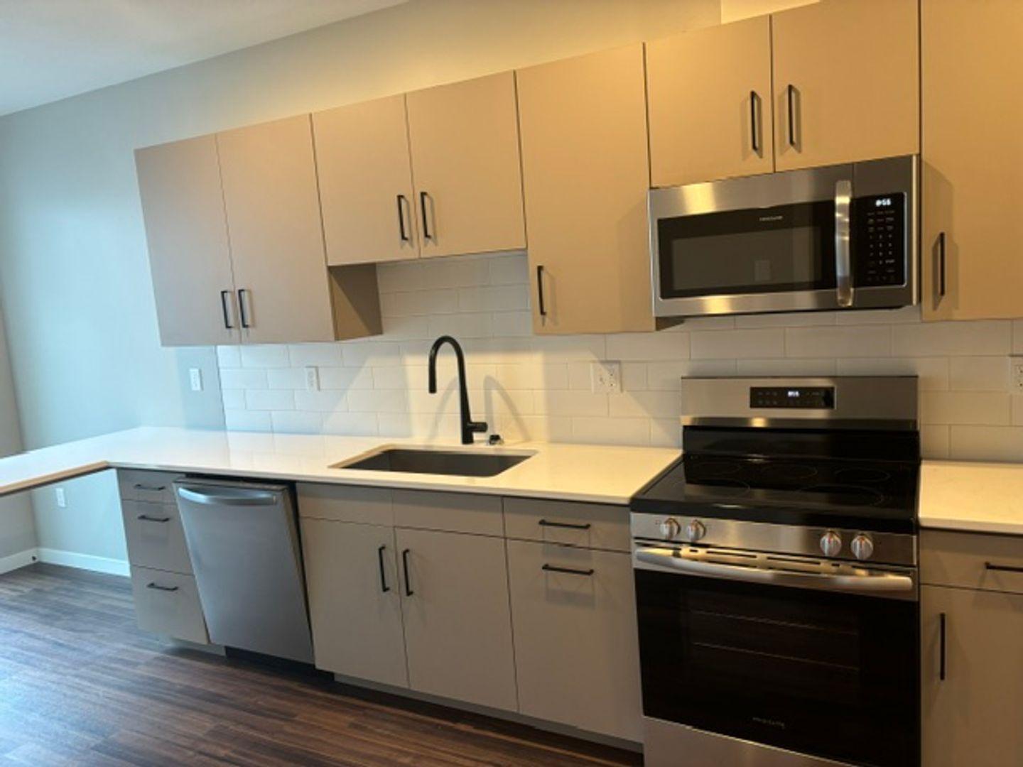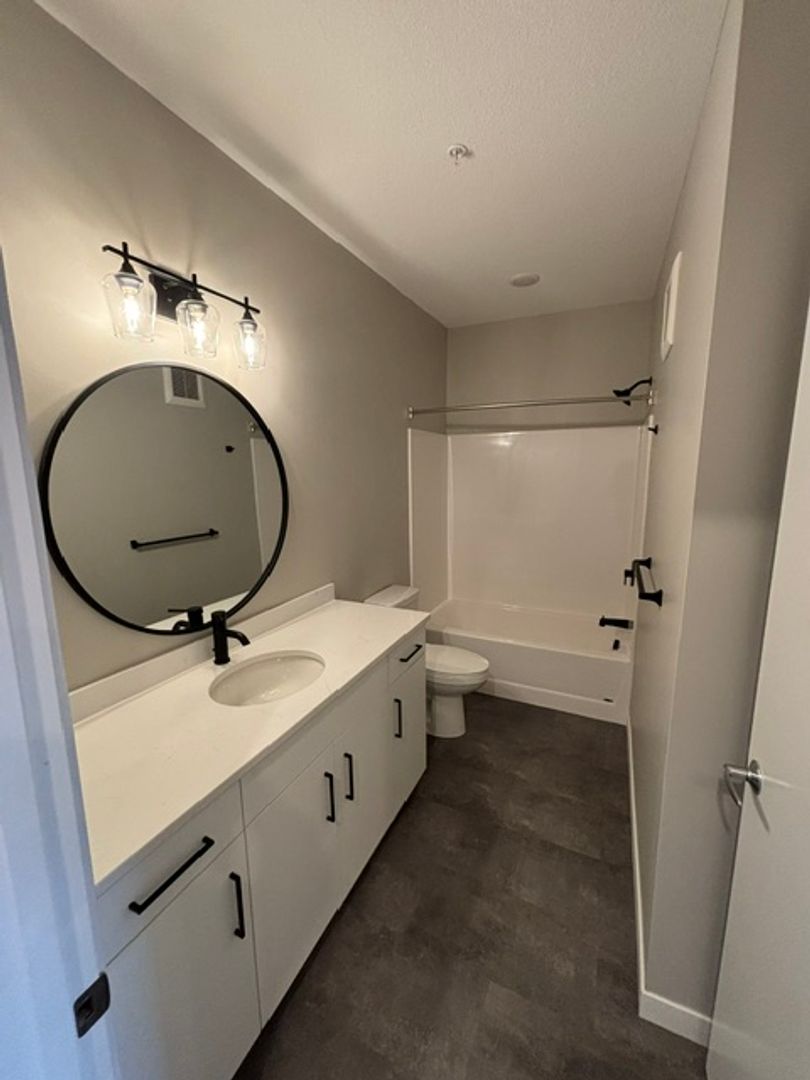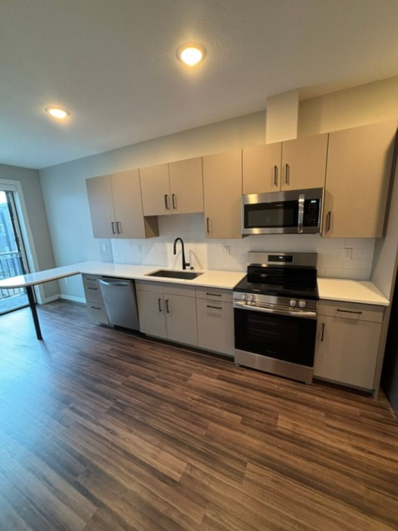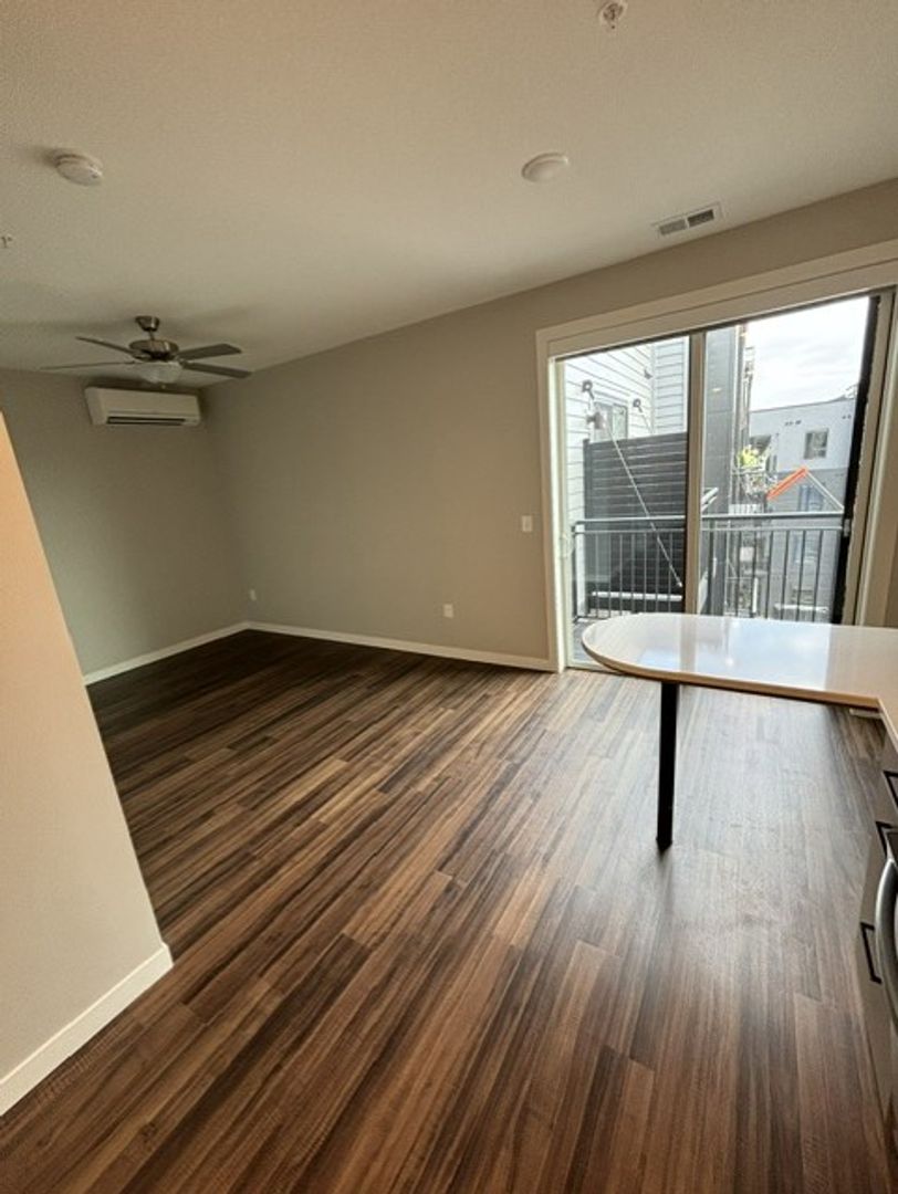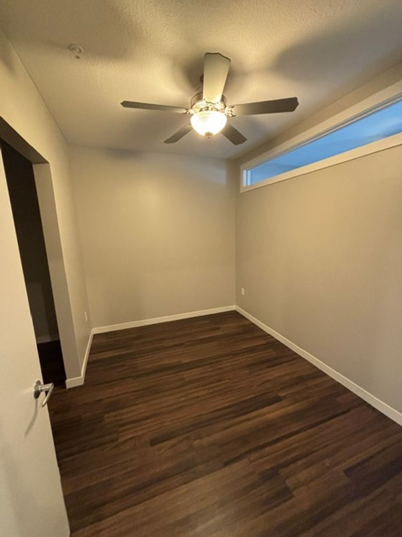 This one-bedroom unit features a transom wall design that allows natural light to flow between the living area and bedroom. The apartment includes a modern kitchen with energy-efficient stainless-steel appliances, quartz countertops, and ample storage. Additional features are laminate wood flooring, a carpeted bedroom, contemporary fixtures, a stackable washer and dryer, window coverings, ceiling fans, a large closet, and a balcony.