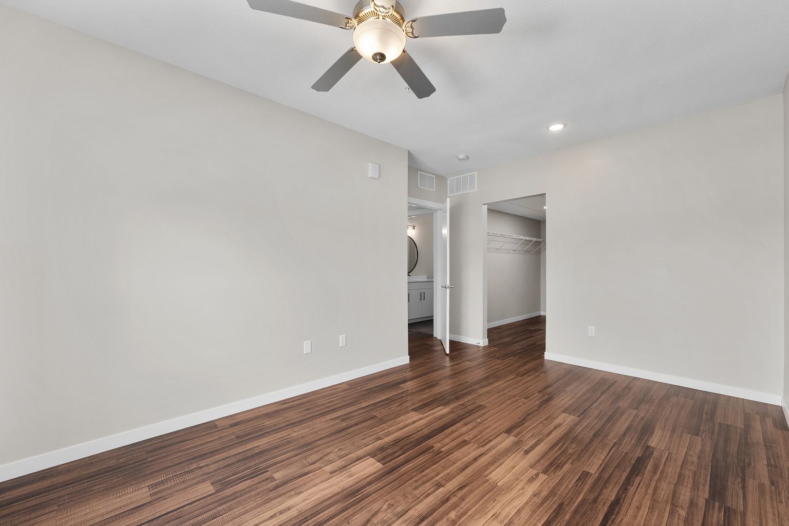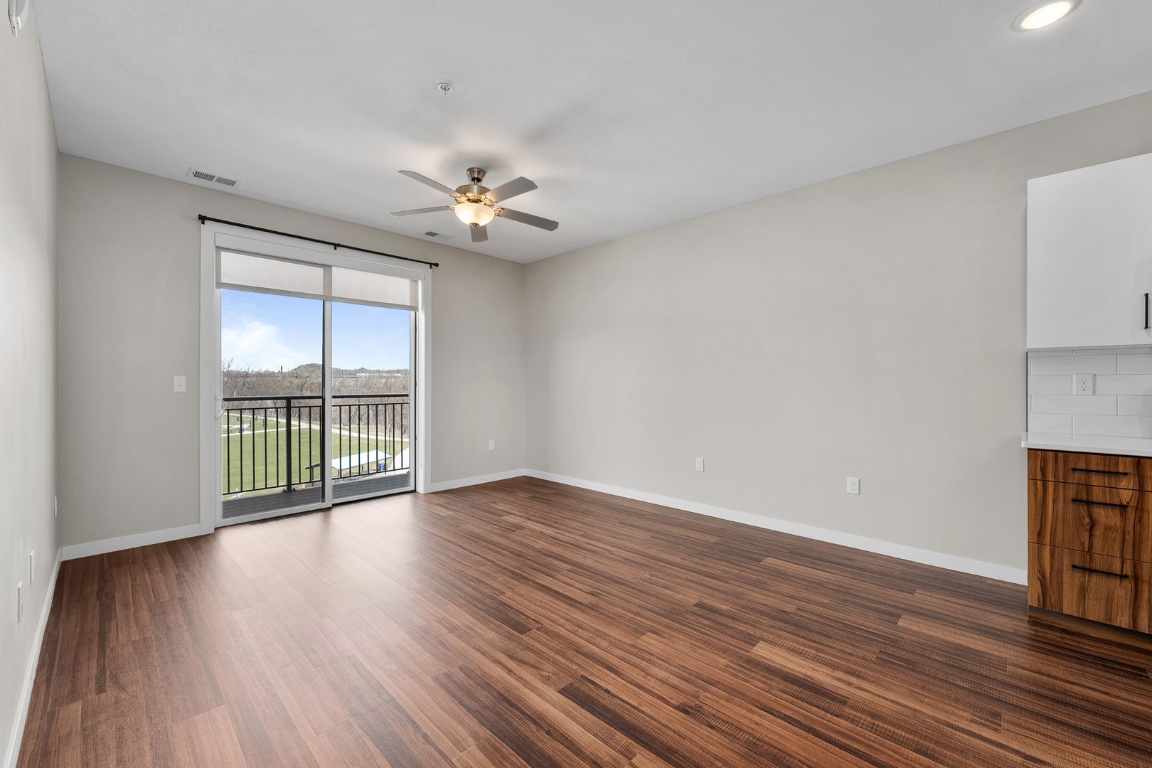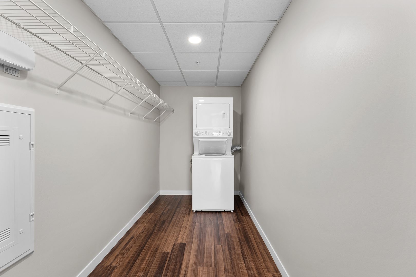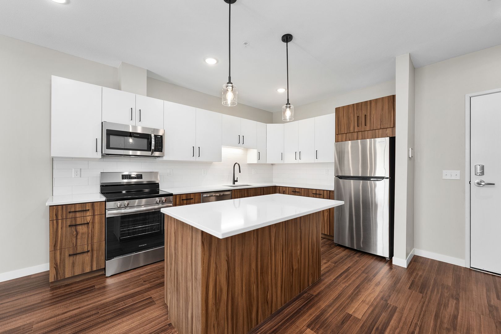 This one-bedroom layout includes a versatile den that can be used as a home office, guest room, craft room, or gaming room. The modern kitchen features energy-efficient stainless-steel appliances, quartz countertops, and ample storage. The apartment also offers laminate wood flooring, contemporary fixtures, a stackable washer and dryer, window coverings, ceiling fans, a large closet, and a private outdoor balcony.