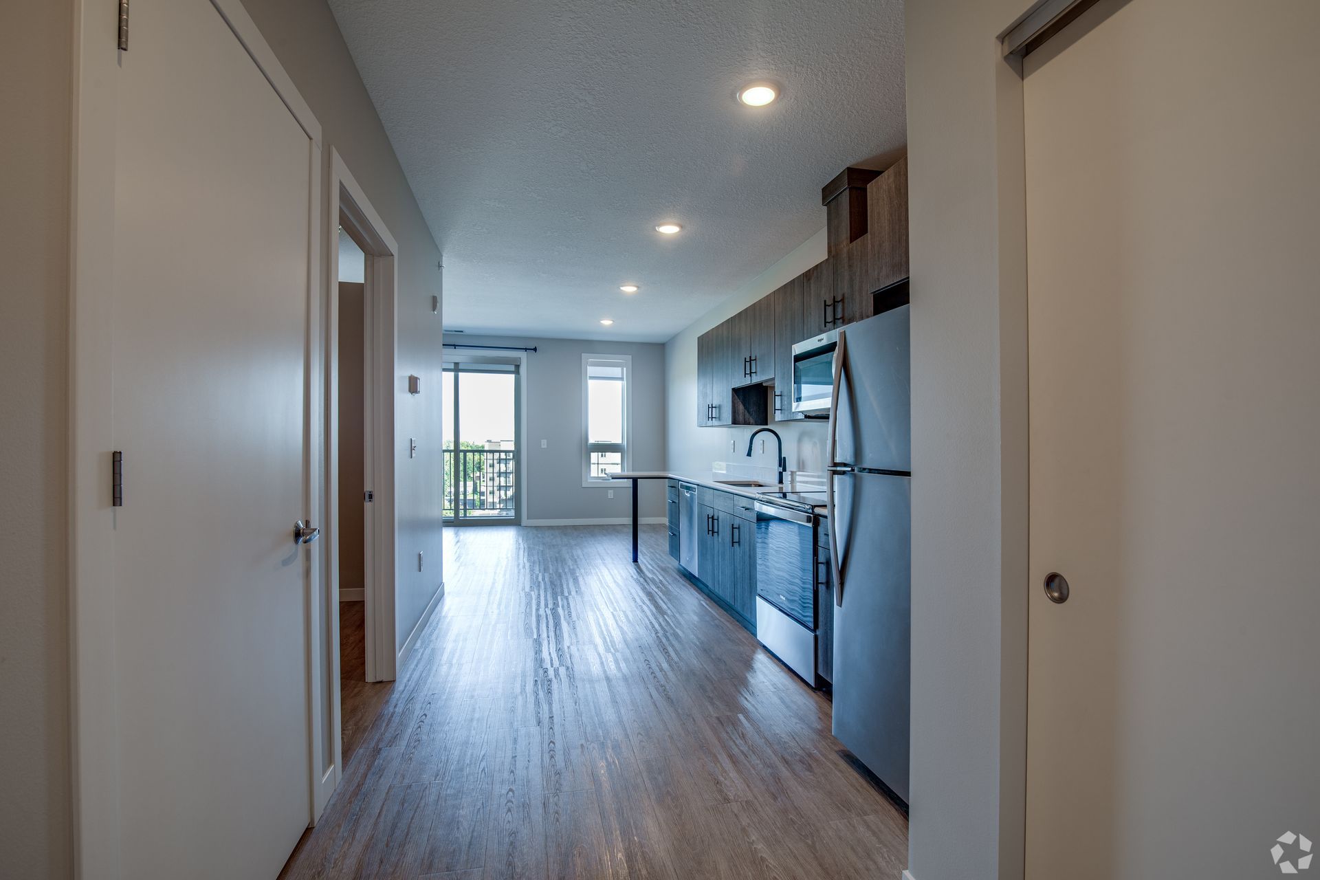 This A.3 Unit shares natural light between the living area and bedroom via transom wall design. The 1-bedroom apartment includes a modern kitchen with energy efficient, stainless-steel appliances, granite countertops, ample storage, laminate wood flooring, modern fixtures, stackable washer and dryer, window coverings, ceiling fans, large closet and high-speed internet.