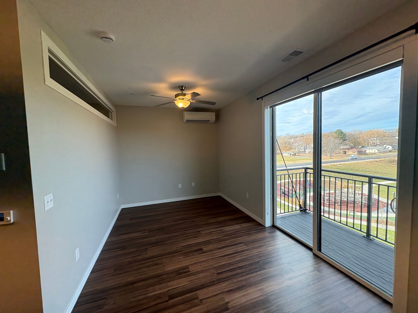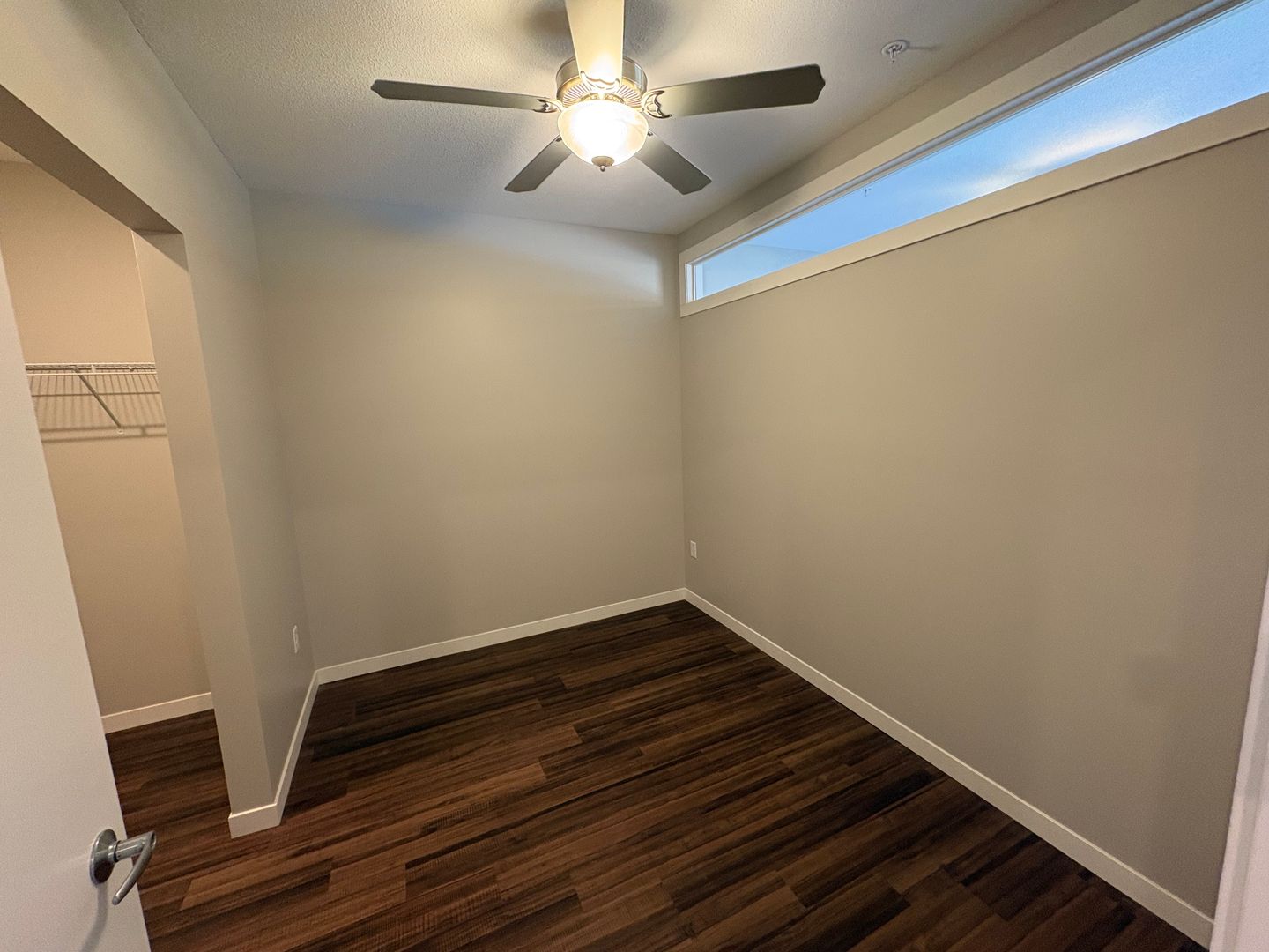 This one-bedroom unit features a transom wall design that allows natural light to flow between the living area and bedroom. The apartment includes a modern kitchen with energy-efficient stainless-steel appliances, quartz countertops, and ample storage. Additional features are laminate wood flooring, a carpeted bedroom, contemporary fixtures, a stackable washer and dryer, window coverings, ceiling fans, a large closet, and a balcony.