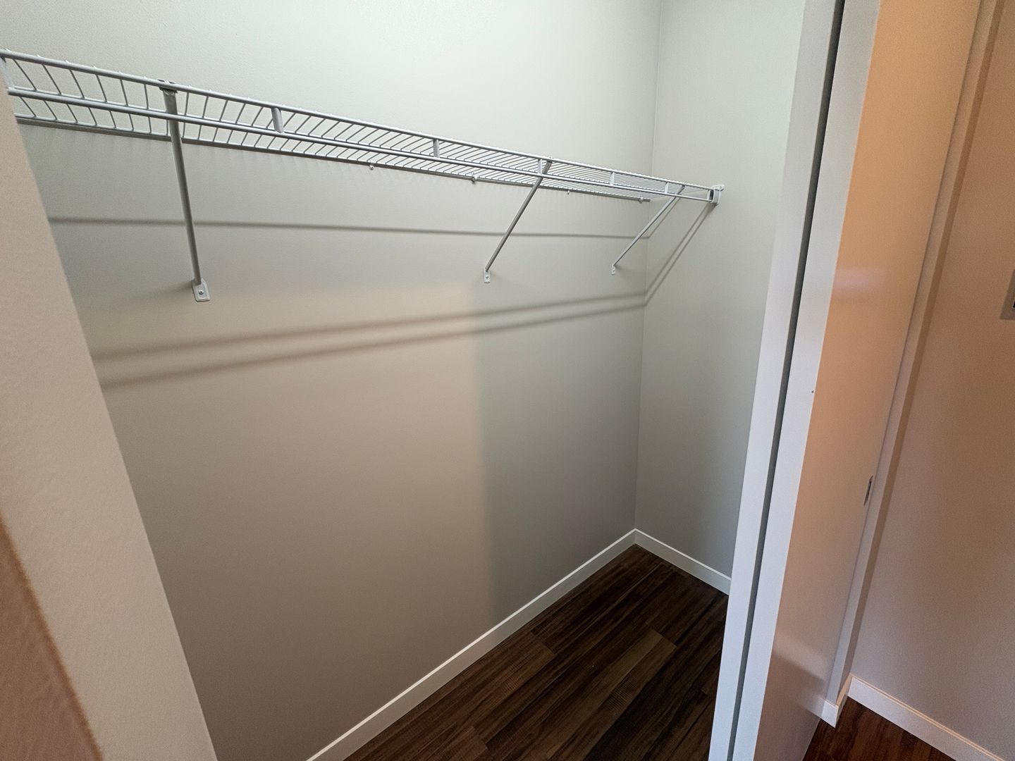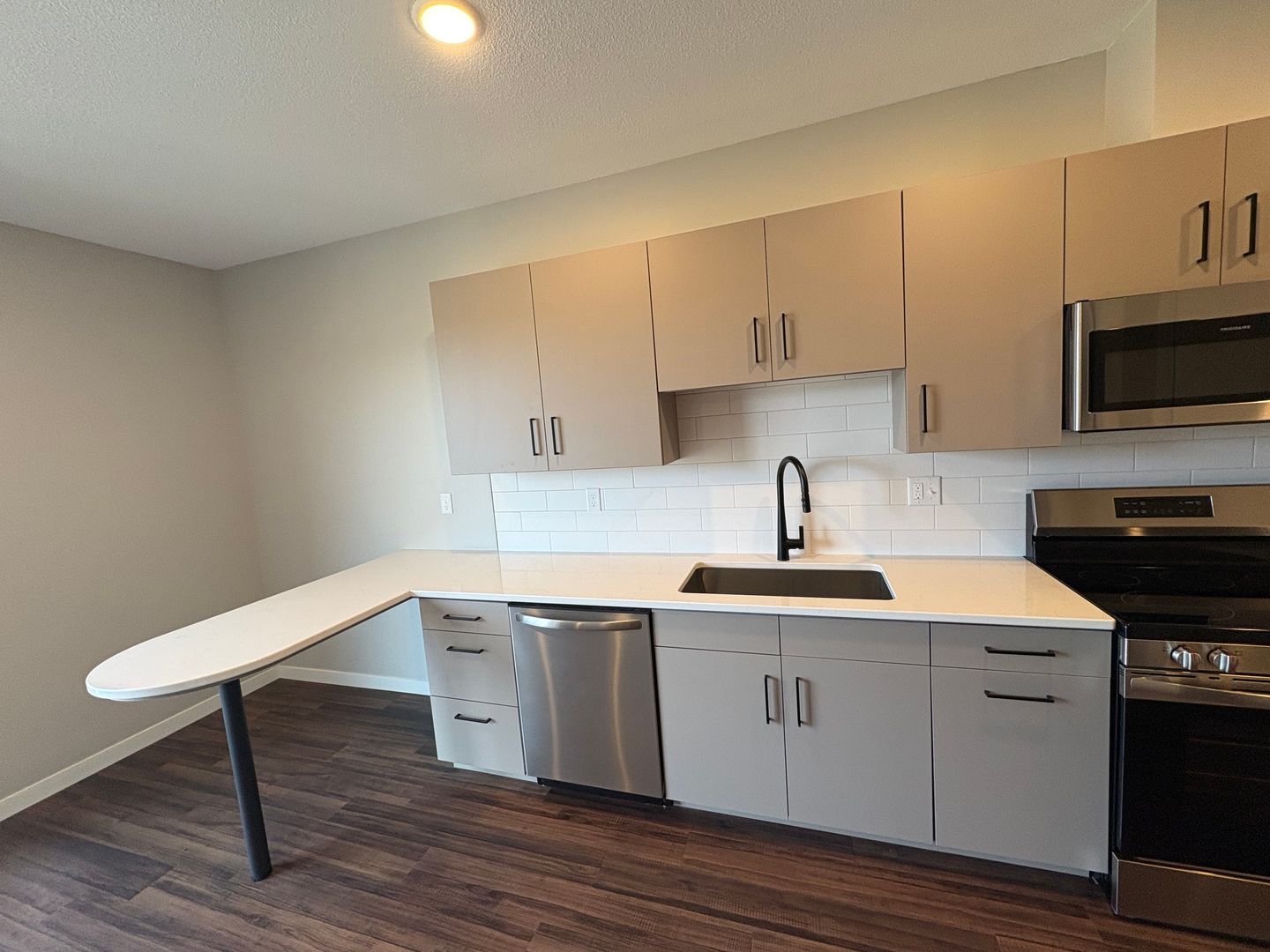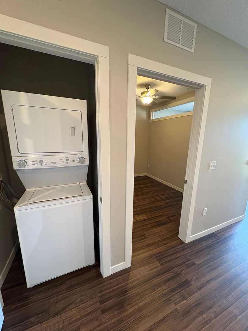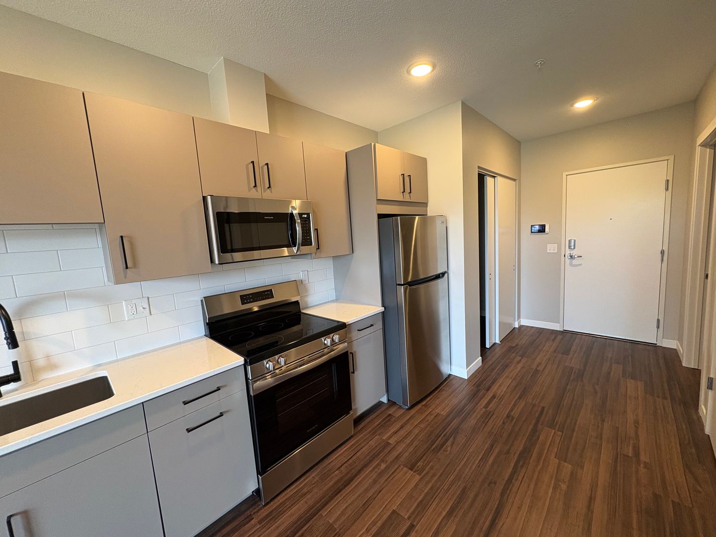 This one-bedroom unit features a transom wall design that allows natural light to flow between the living area and bedroom. The apartment includes a modern kitchen with energy-efficient stainless-steel appliances, quartz countertops, and ample storage. Additional features are laminate wood flooring, a carpeted bedroom, contemporary fixtures, a stackable washer and dryer, window coverings, ceiling fans, a large closet, and a balcony. This unit is an affordable apartment based on 80% of the Area Median Income (AMI) and does have some income restrictions.