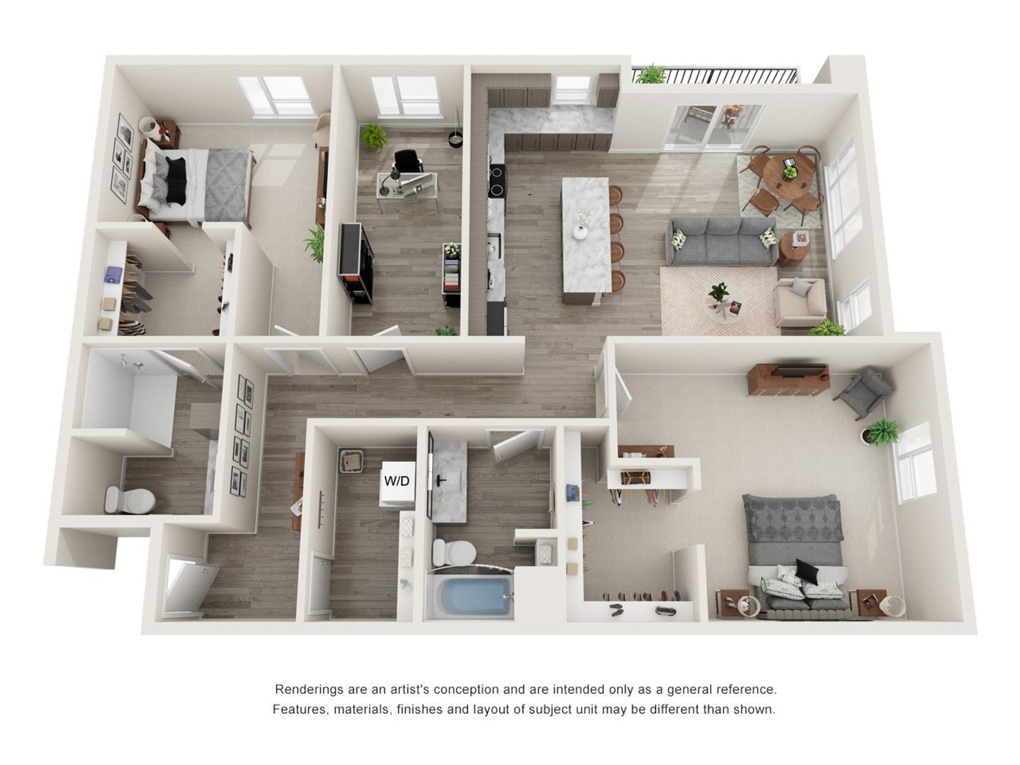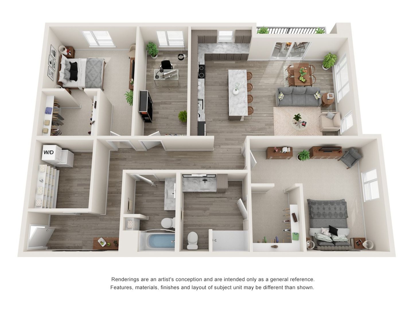 This C.2 Unit has all the features of our 2-bedroom, 2-bathroom unit, plus a den for added flexibility—envision a home office, guest room, craft room or even a gaming room. This apartment also includes a modern kitchen with energy efficient, stainless-steel appliances, including a gas cooktop stove and wall oven, granite countertops, 5' island with an under-counter, pull-out trash receptacle. The unit has laminate wood flooring, carpeted bedrooms, modern fixtures, state-of-the-art window coverings, ceiling fans, large closets, high-speed internet, and a private outdoor balcony.