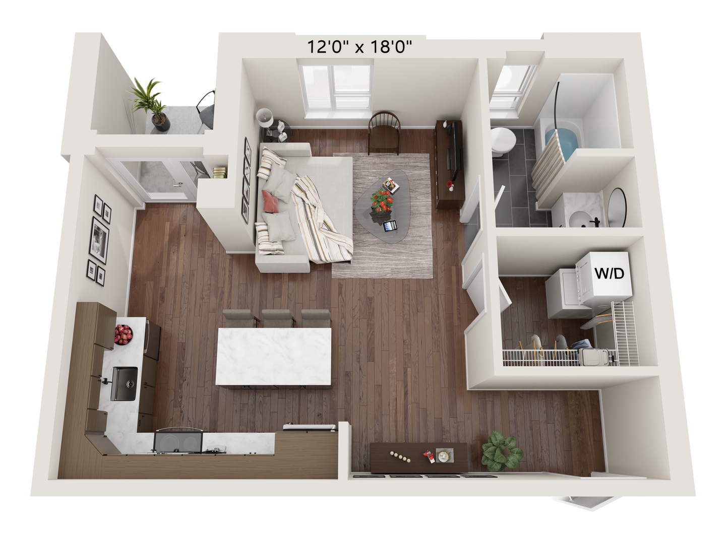 This main floor studio apartment is a multi-functional space—with room for living during the day and a comfortable space to stretch out when it is time for bed. This studio apartment comes with a modern kitchen with energy efficient, stainless-steel appliances, quartz countertops, ample storage, laminate wood flooring, modern fixtures, stackable washer and dryer, window coverings, ceiling fan, large closet and a Private outdoor patio