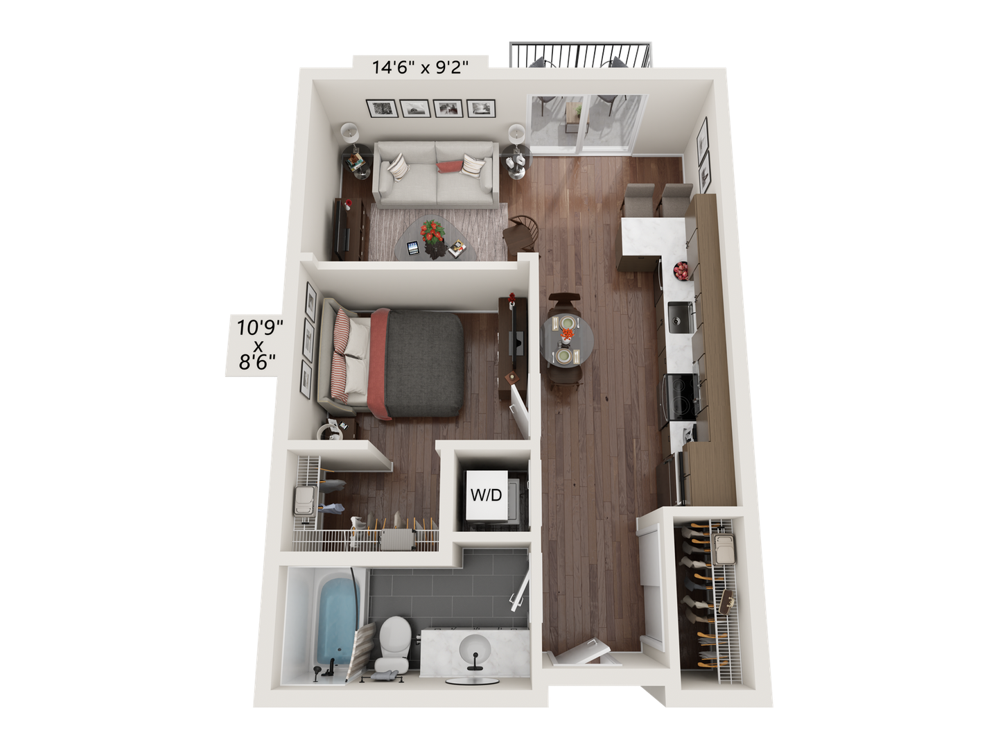 This one-bedroom unit features a transom wall design that allows natural light to flow between the living area and bedroom. The apartment includes a modern kitchen with energy-efficient stainless-steel appliances, quartz countertops, and ample storage. Additional features are laminate wood flooring, contemporary fixtures, a stackable washer and dryer, window coverings, ceiling fans, a large closet, and a balcony.