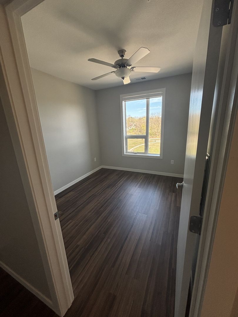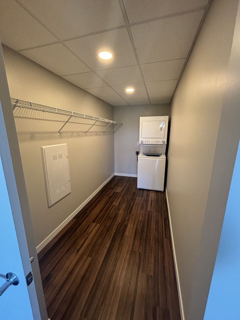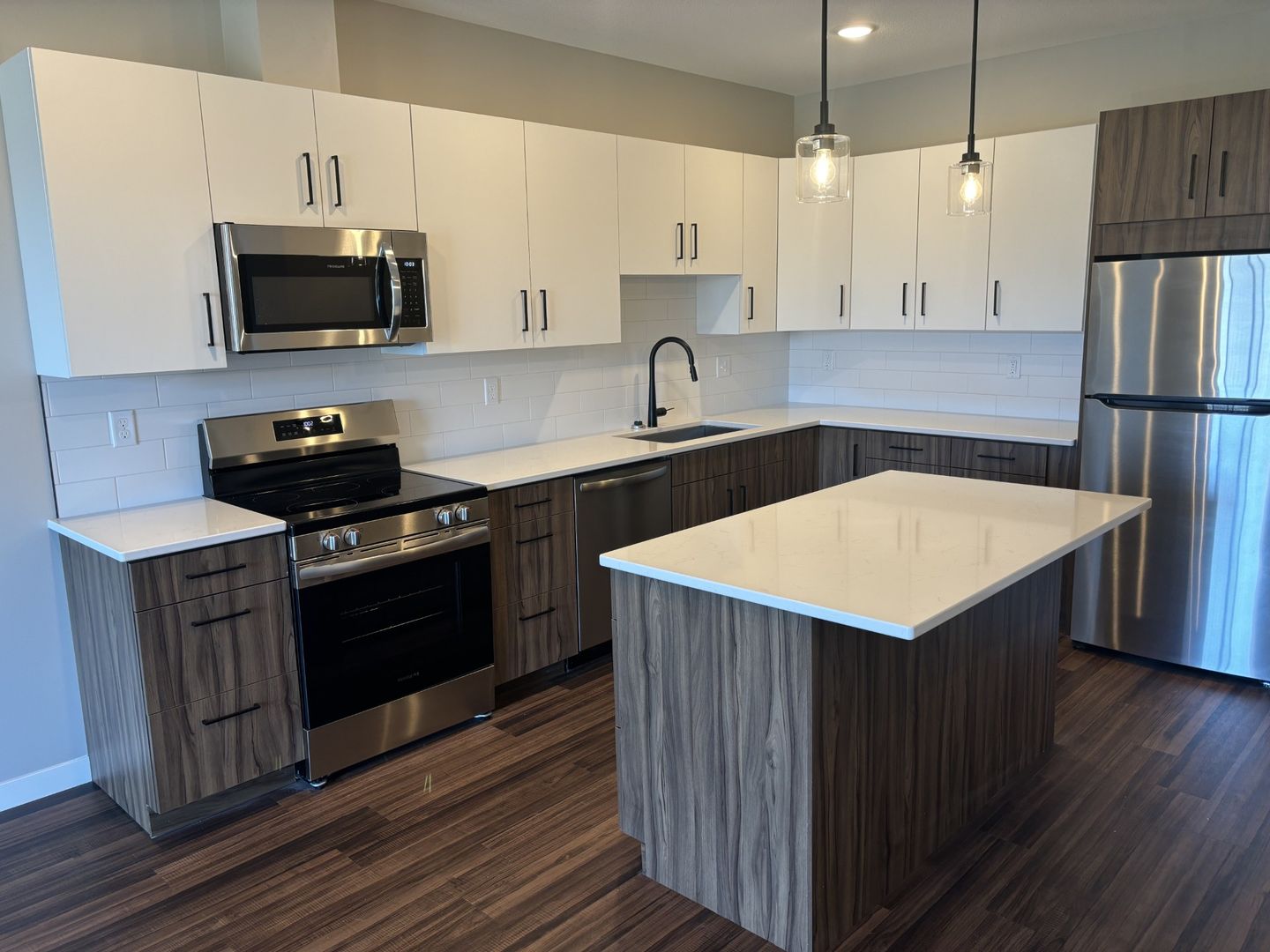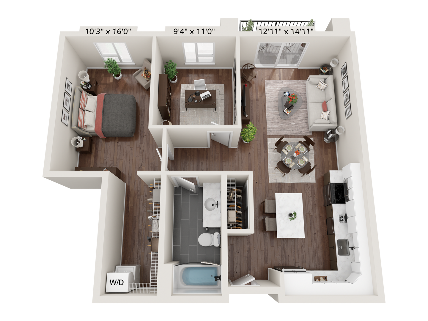 This one-bedroom layout includes a versatile den that can be used as a home office, guest room, craft room, or gaming room. The modern kitchen features energy-efficient stainless-steel appliances, quartz countertops, and ample storage. The apartment also offers laminate wood flooring, contemporary fixtures, a stackable washer and dryer, window coverings, ceiling fans, a large closet, and a private outdoor balcony.