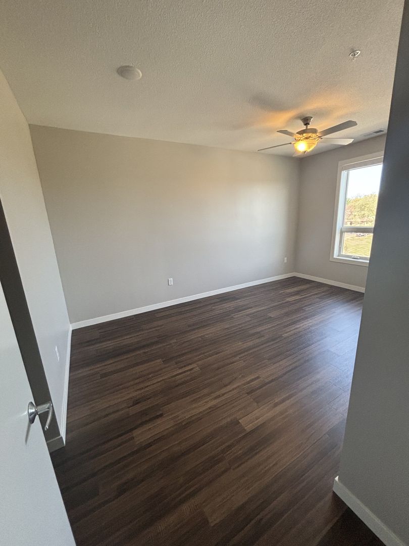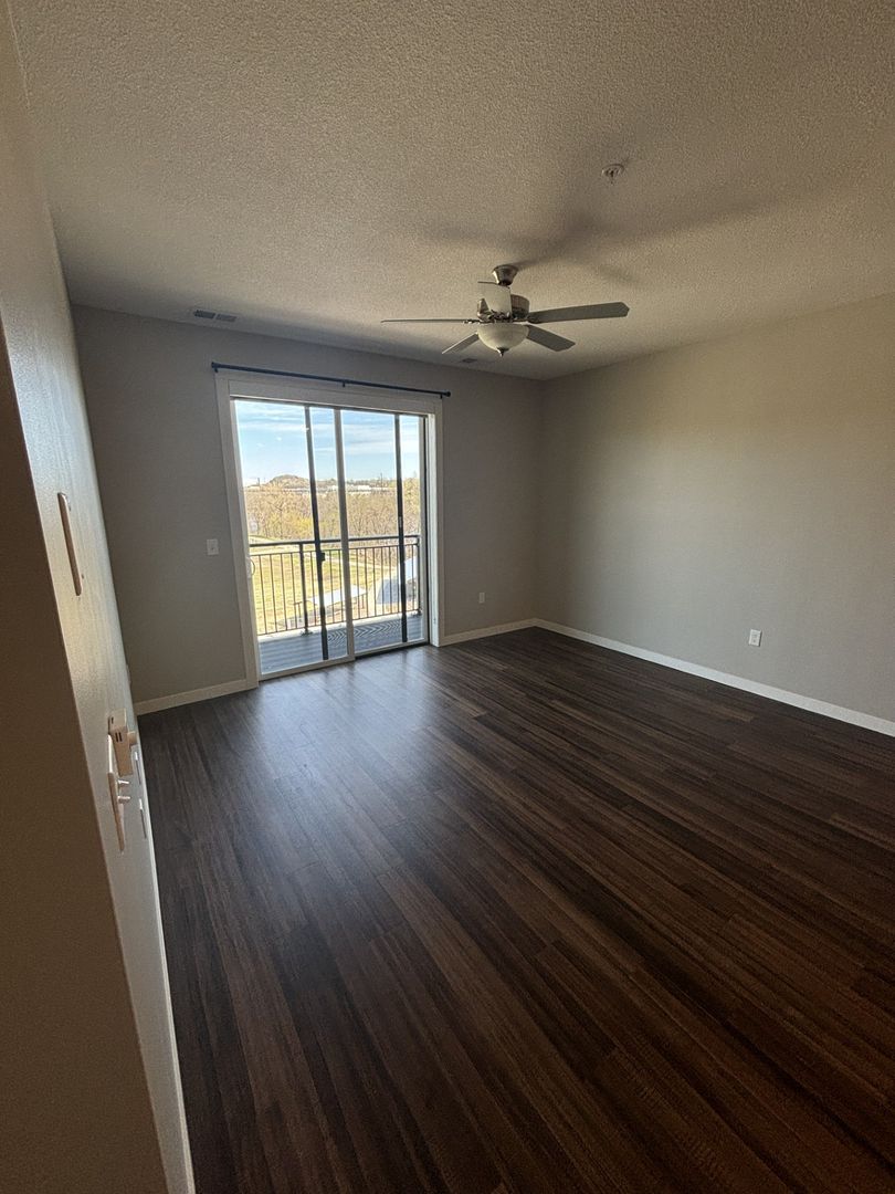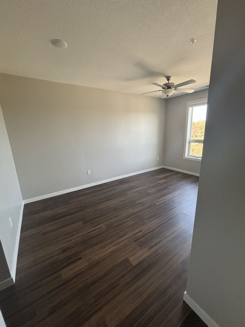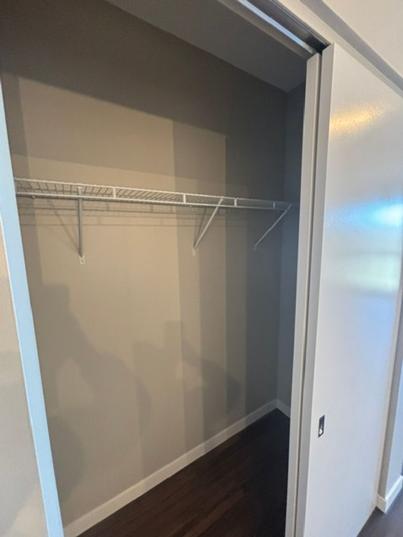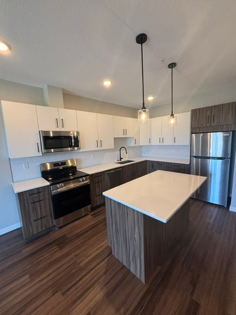 This one-bedroom layout includes a versatile den that can be used as a home office, guest room, craft room, or gaming room. The modern kitchen features energy-efficient stainless-steel appliances, quartz countertops, and ample storage. The apartment also offers laminate wood flooring, contemporary fixtures, a stackable washer and dryer, window coverings, ceiling fans, a large closet, and a private outdoor balcony.