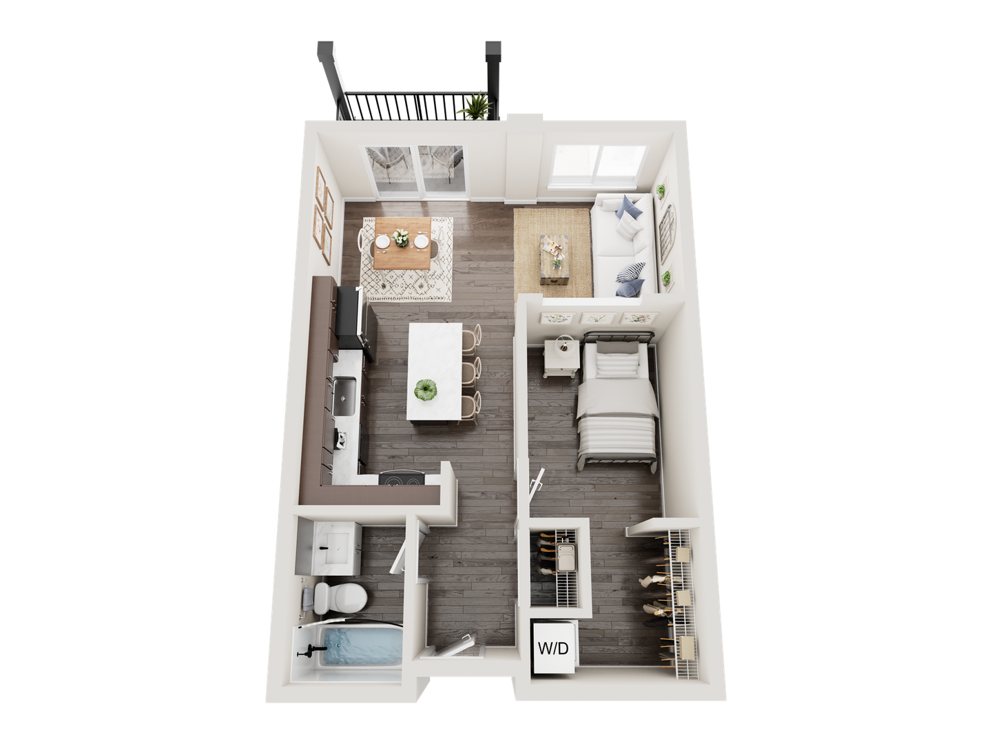 This one-bedroom unit features a transom wall design that allows natural light to flow between the living area and bedroom. The apartment includes a modern kitchen with energy-efficient stainless-steel appliances, energy efficient air conditioning & in-floor radiant heat, quartz countertops, and ample storage. Additional features are laminate wood flooring, contemporary fixtures, a stackable washer and dryer, window coverings, ceiling fans, a large closet, and a balcony. This unit is an affordable apartment based on 80% of the Area Median Income (AMI) and does have income restrictions. The max gross income is $60,838 for one person, per year.