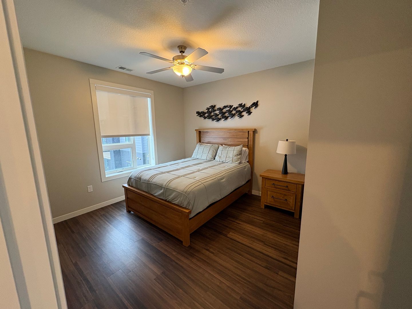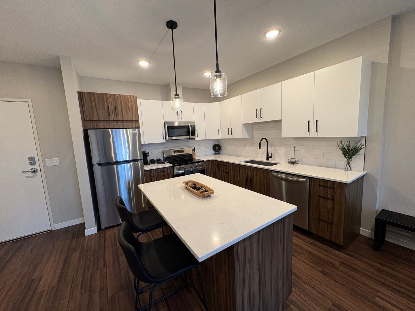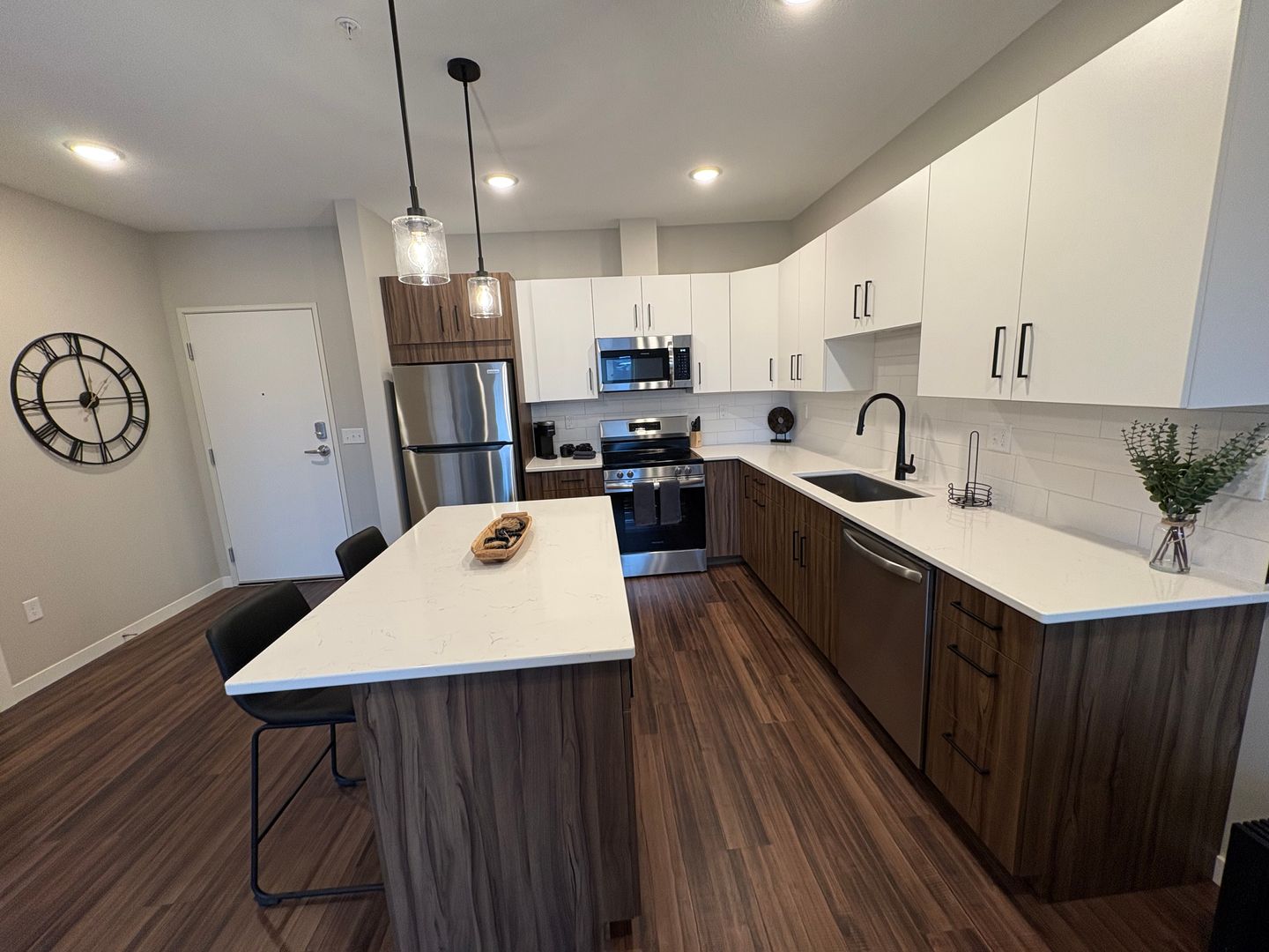 This is a gorgeous fully-furnished one-bedroom apartment on the top floor with a modern eat-in kitchen containing energy-efficient stainless-steel appliances, quartz countertops, and a generous coat closet for extra storage. The unit also features elegant laminate wood flooring, contemporary fixtures, a convenient stackable washer and dryer, window coverings, ceiling fans, a spacious closet, and a private outdoor balcony.