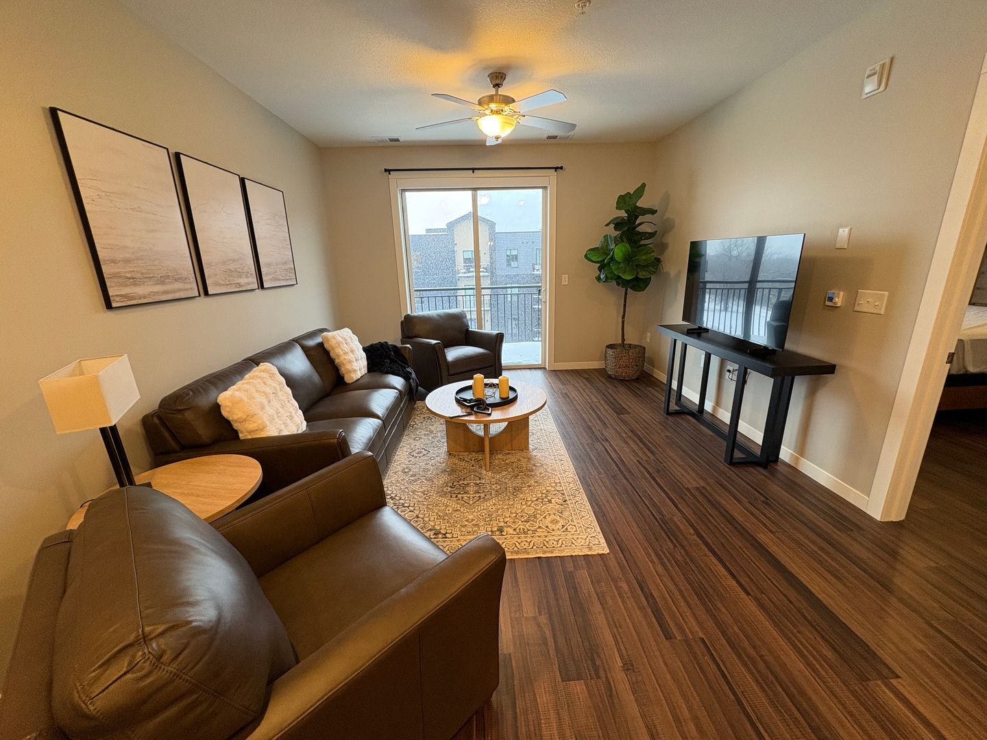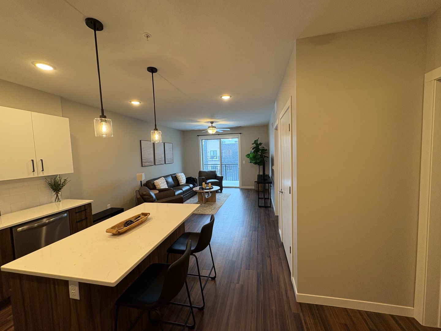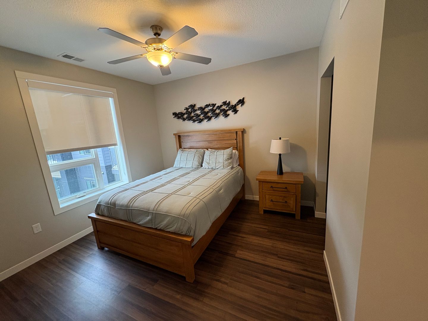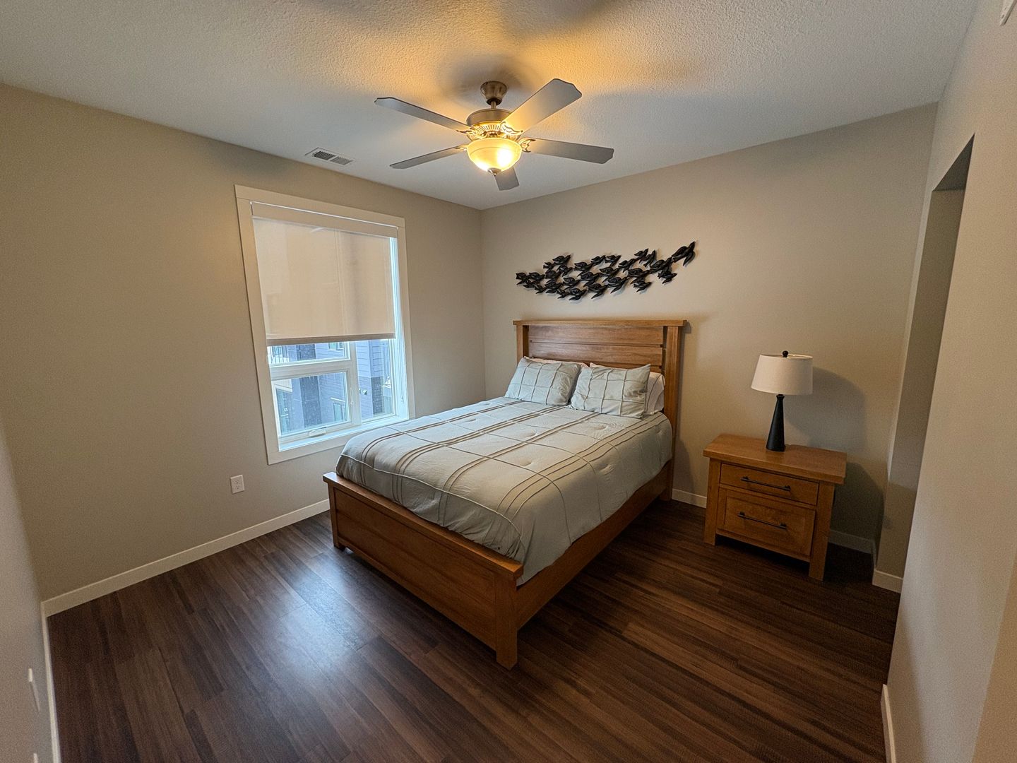 This is a gorgeous fully-furnished one-bedroom apartment on the top floor with a modern eat-in kitchen containing energy-efficient stainless-steel appliances, quartz countertops, and a generous coat closet for extra storage. The unit also features elegant laminate wood flooring, contemporary fixtures, a convenient stackable washer and dryer, window coverings, ceiling fans, a spacious closet, and a private outdoor balcony.