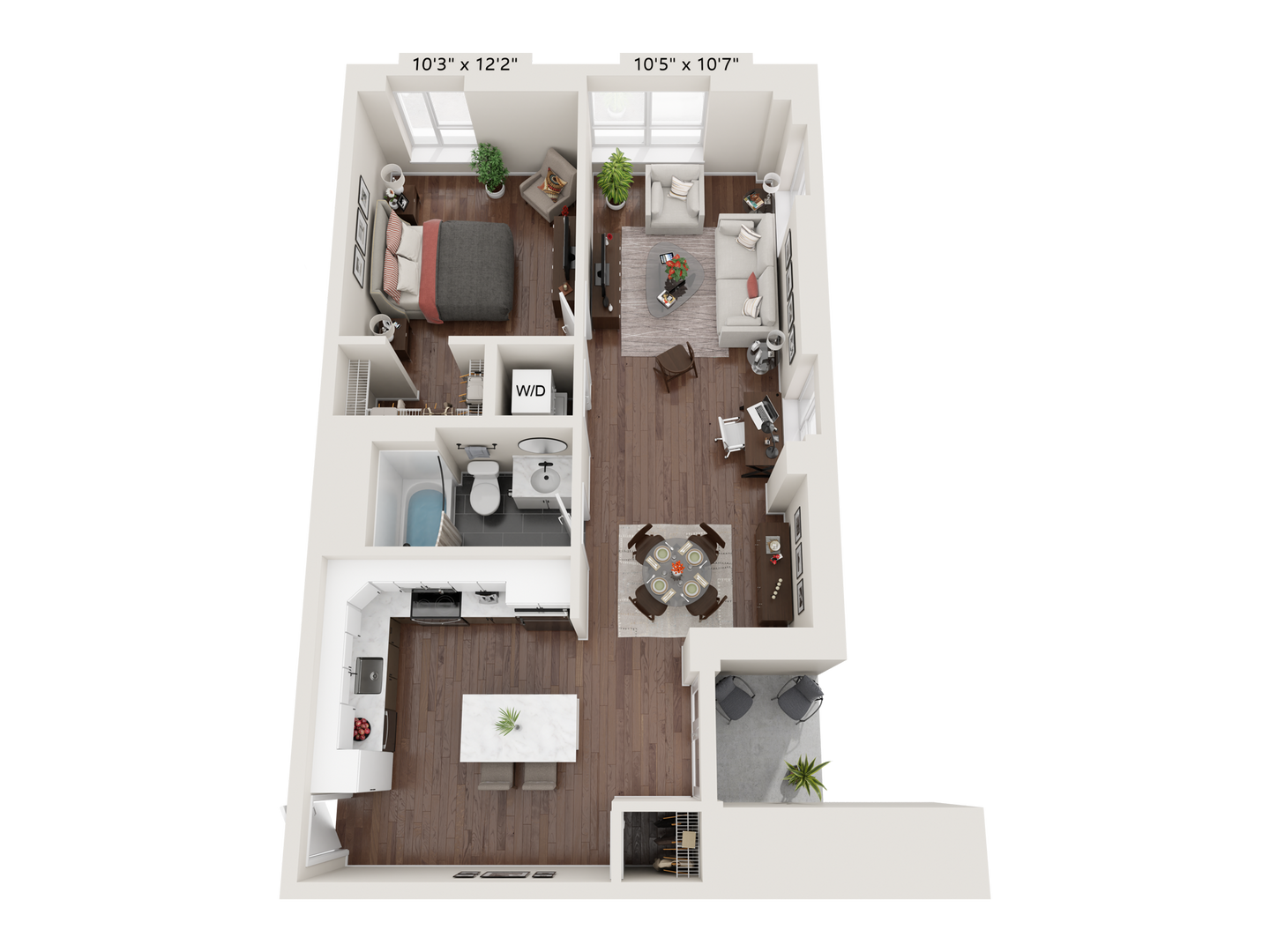 This main floor one-bedroom unit boasts a modern eat-in kitchen with energy-efficient stainless-steel appliances, granite countertops, and a 4-foot island. Additional features include a coat closet for extra storage, laminate wood flooring, modern fixtures, a stackable washer and dryer, window coverings, ceiling fans, spacious closets, and a private outdoor patio.