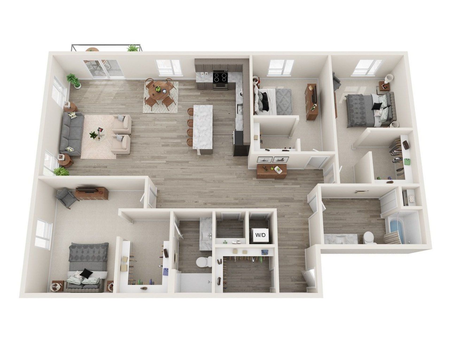 In the D.1 unit there is room for everyone with this spacious 3-Bedroom layout. The amenities abound with a large master-suite and bedrooms, spacious bathrooms, walk-in closets, ample storage, open layout, eat-in kitchen, pantry closet, and so much more. The unit includes a modern kitchen with energy efficient stainless-steel appliances, granite countertops, ample storage space, laminate wood flooring, modern fixtures, stackable washer and dryer, high speed internet access, and a private outdoor balcony. Central Flats also offers a state-of-the-art fitness center, a virtual fitness room, pet spa, conference room, and multiple community areas for our residents to enjoy. The outdoor amenity area includes gourmet grilling stations.