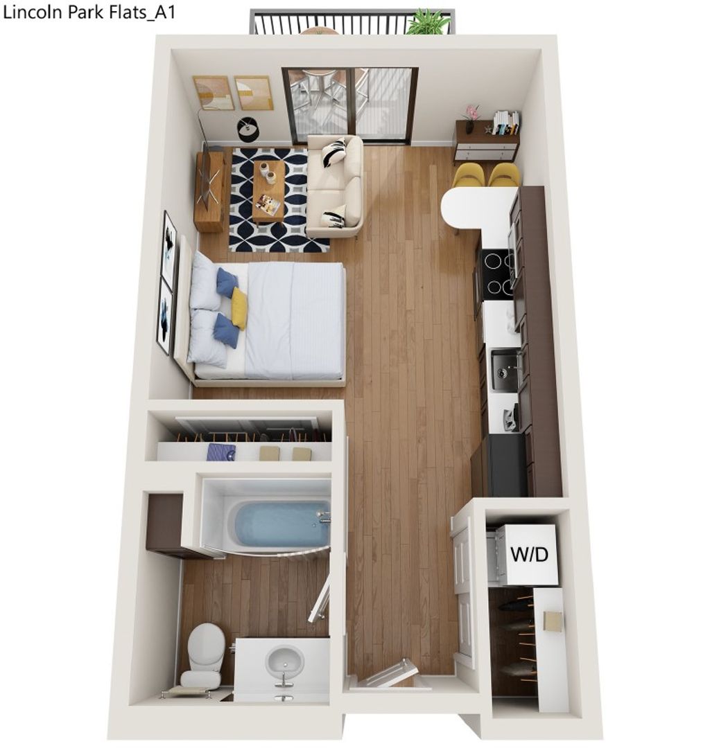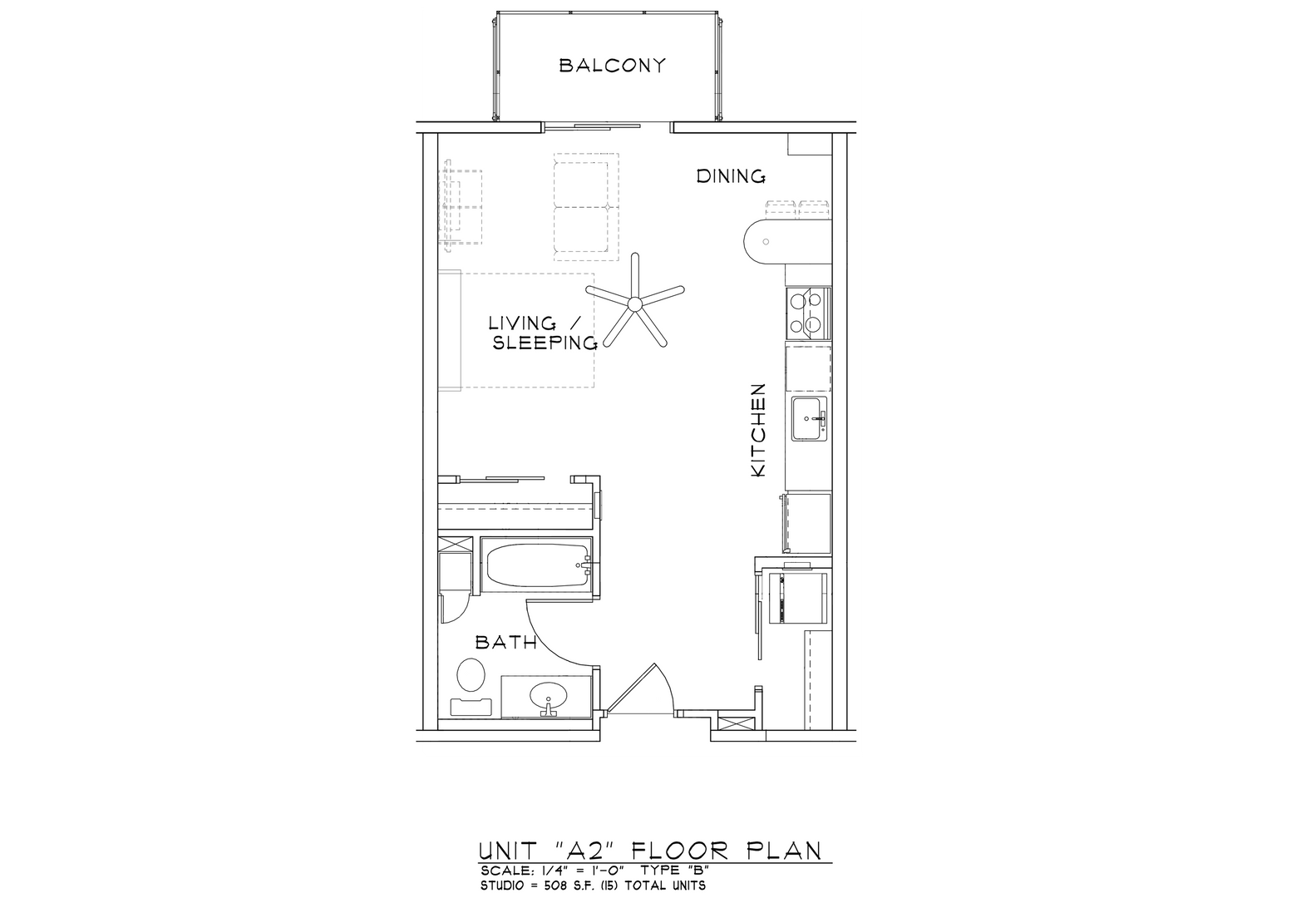 The Unit S.1-S.3 are studio apartments with modern kitchen, energy efficient, stainless-steel appliances, quartz countertops, large closet, laminate wood flooring throughout, modern fixtures, stackable in-unit washer and dryer, window covering, ceiling fan.
