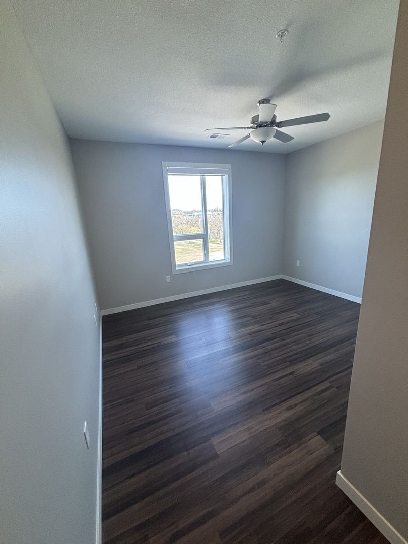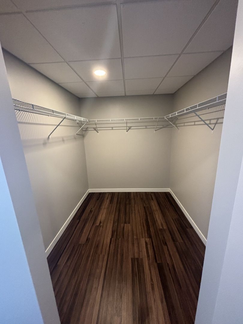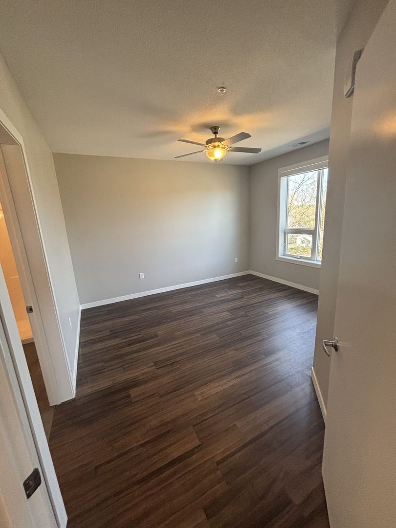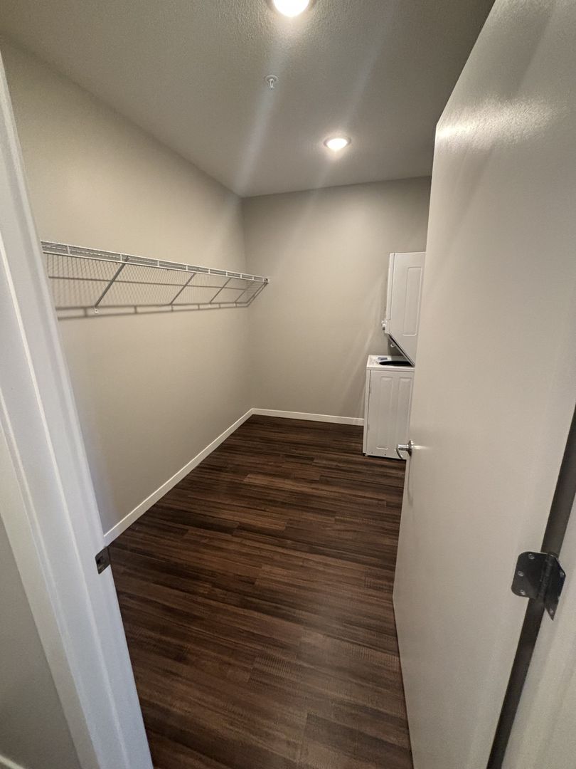 This corner two-bedroom layout boasts abundant storage and the convenience of a full laundry room. The apartment features a modern kitchen with energy-efficient stainless-steel appliances, quartz countertops, and ample storage. Additional highlights include laminate wood flooring, modern fixtures, window coverings, ceiling fans, large closets, and a private outdoor balcony.
