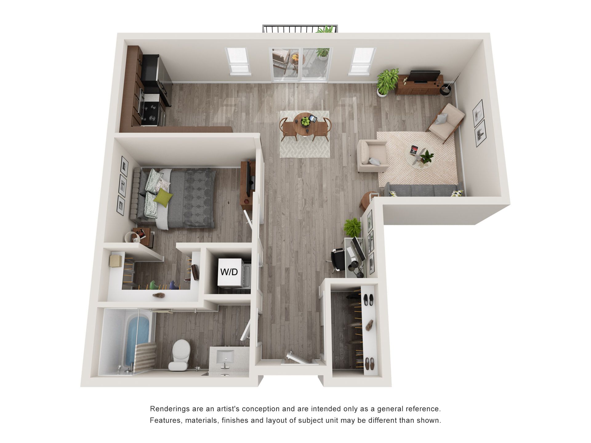 This Alcove Unit shares natural light between the living area and bedroom via a transom wall or partial wall design. This 1-bedroom apartment includes a modern kitchen with energy efficient, stainless-steel appliances, quartz countertops, ample storage, luxury vinyl tile flooring throughout, modern fixtures, stackable in-unit washer and dryer, window coverings, ceiling fans, large closet, and high-speed internet. The Alcove Units also features a bathtub with rainfall showerhead, oversized windows, 9-foot ceilings and 10-foot balcony on select units.