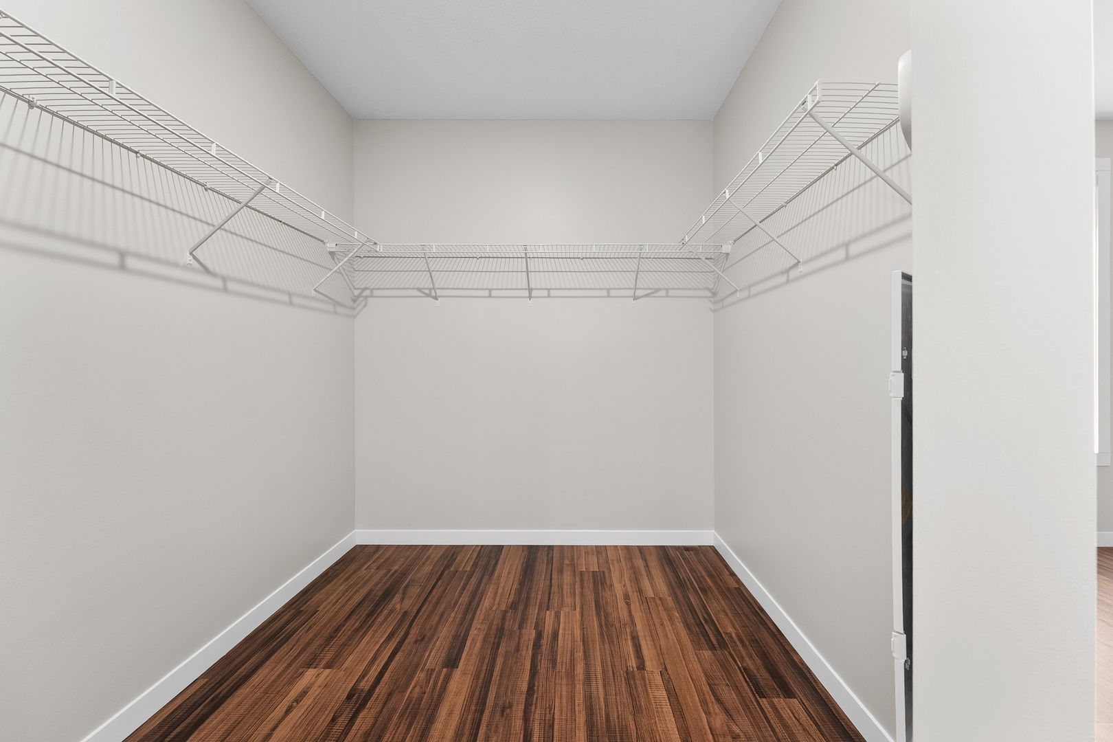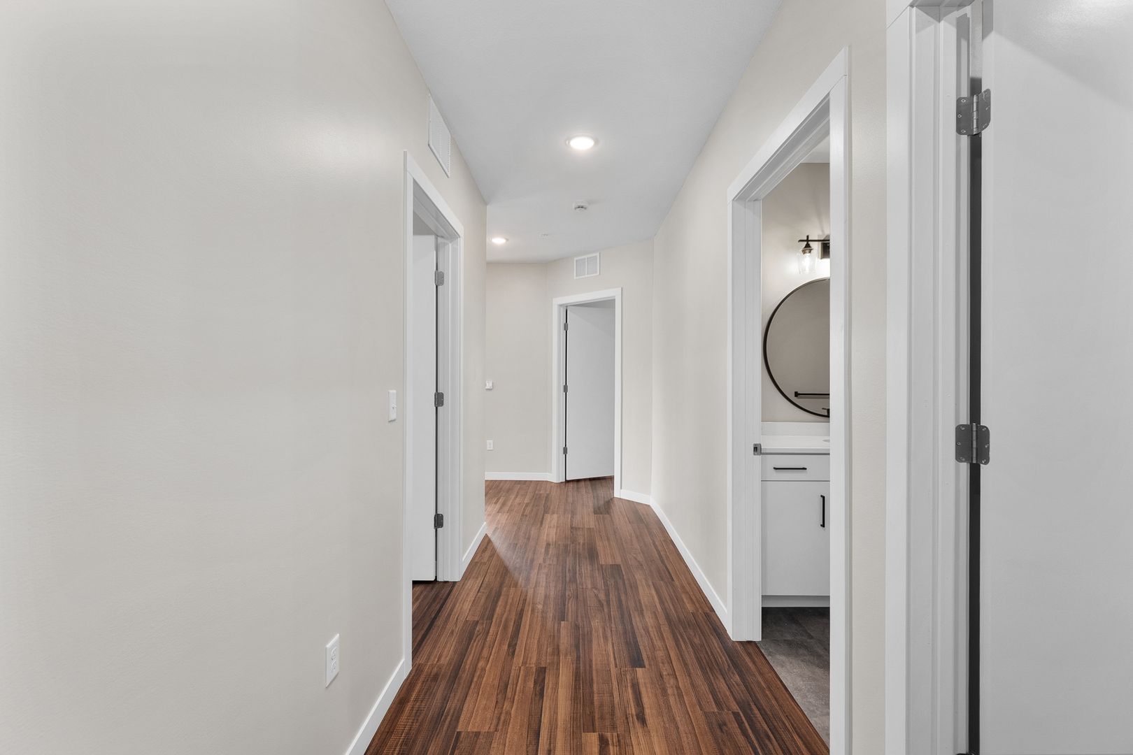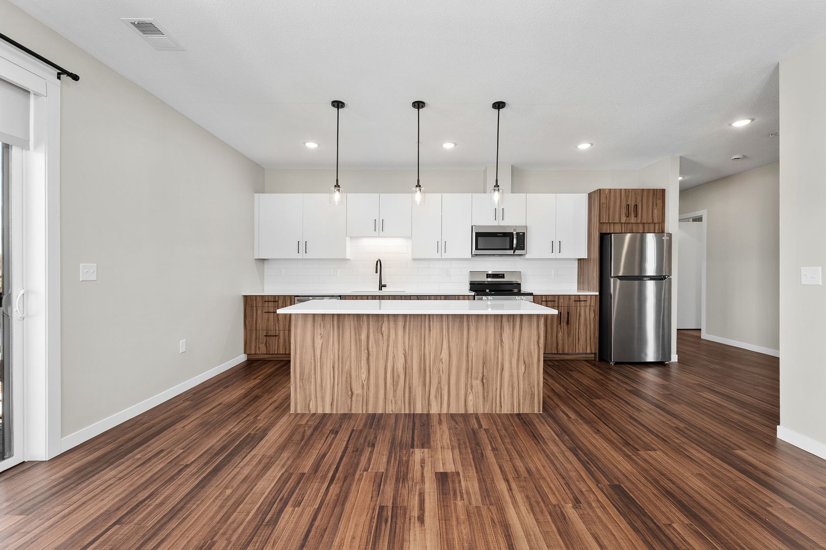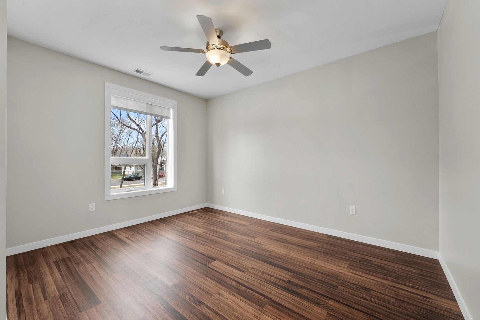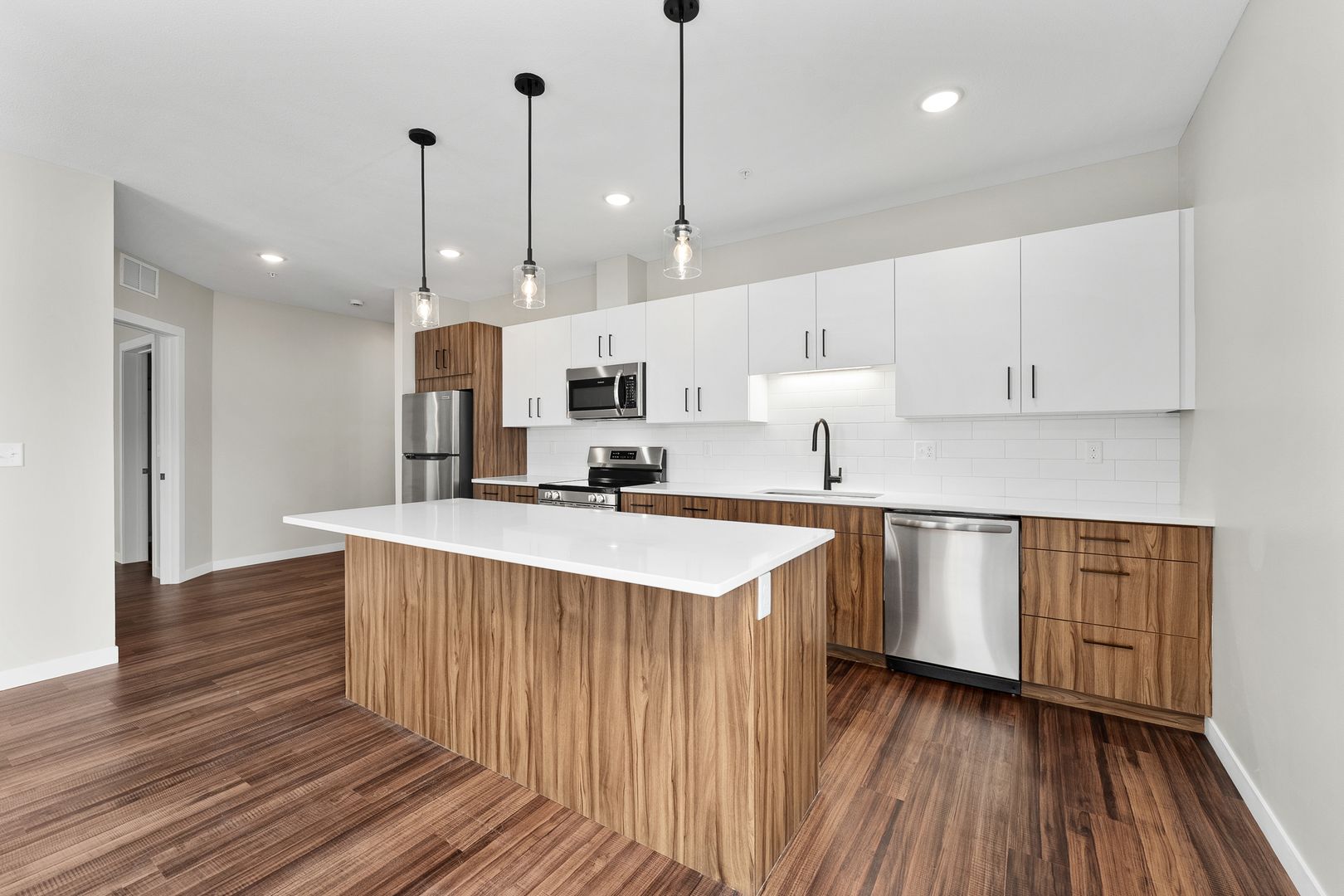 This corner two-bedroom layout boasts abundant storage and the convenience of a full laundry room. The apartment features a modern kitchen with energy-efficient stainless-steel appliances, quartz countertops, and ample storage. Additional highlights include laminate wood flooring, modern fixtures, window coverings, ceiling fans, large closets, and a private outdoor balcony.