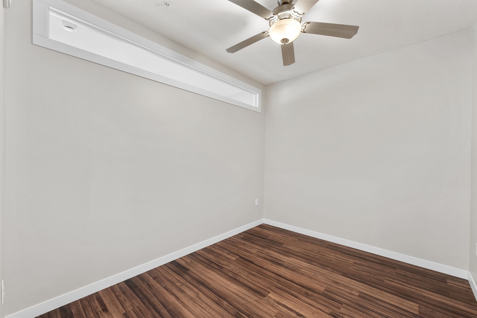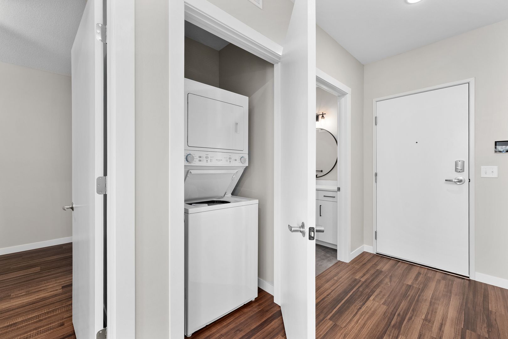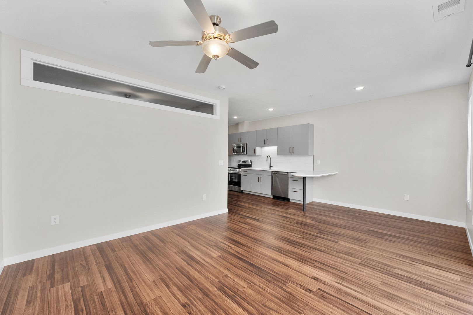 This one-bedroom unit features a transom wall design that allows natural light to flow between the living area and bedroom. The apartment includes a modern kitchen with energy-efficient stainless-steel appliances, quartz countertops, and ample storage. Additional features are laminate wood flooring, a large living room, contemporary fixtures, a stackable washer and dryer, window coverings, ceiling fans, a large closet, and a balcony.