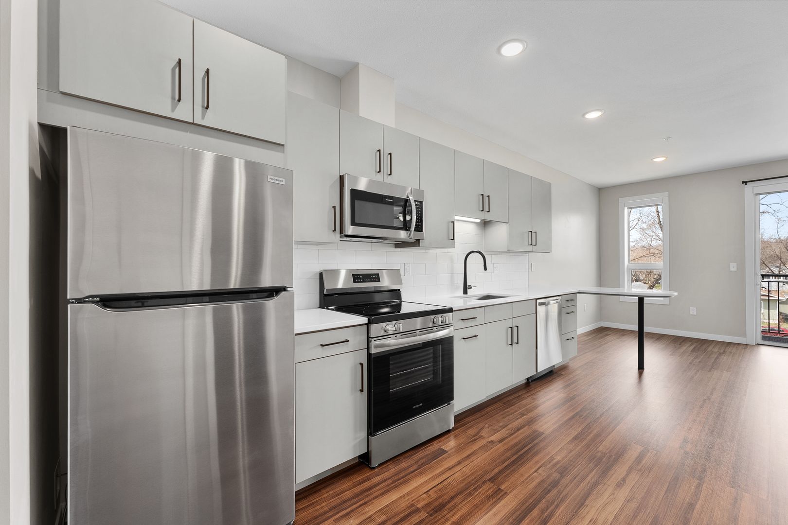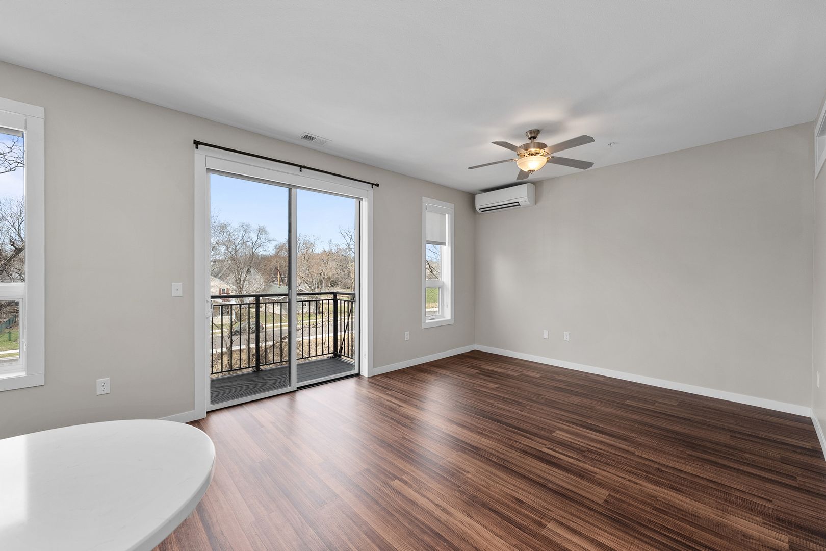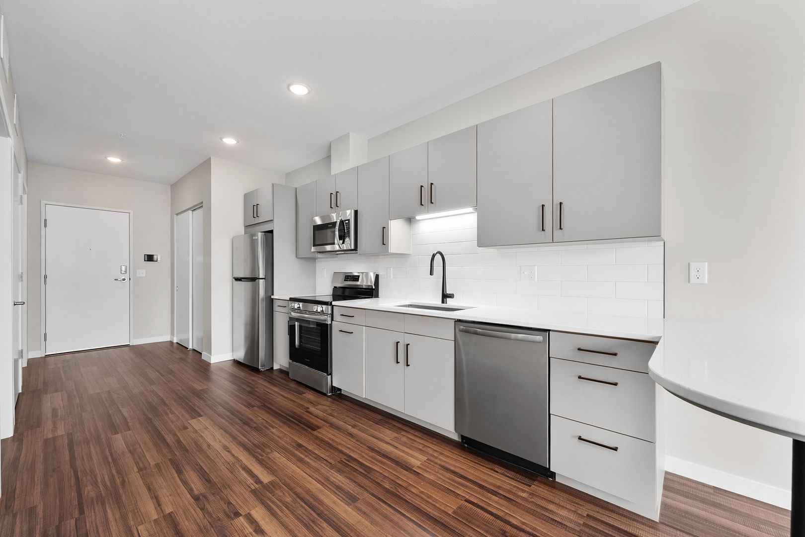 This one-bedroom unit features a transom wall design that allows natural light to flow between the living area and bedroom. The apartment includes a modern kitchen with energy-efficient stainless-steel appliances, quartz countertops, and ample storage. Additional features are laminate wood flooring, a large living room, contemporary fixtures, a stackable washer and dryer, window coverings, ceiling fans, a large closet, and a balcony.