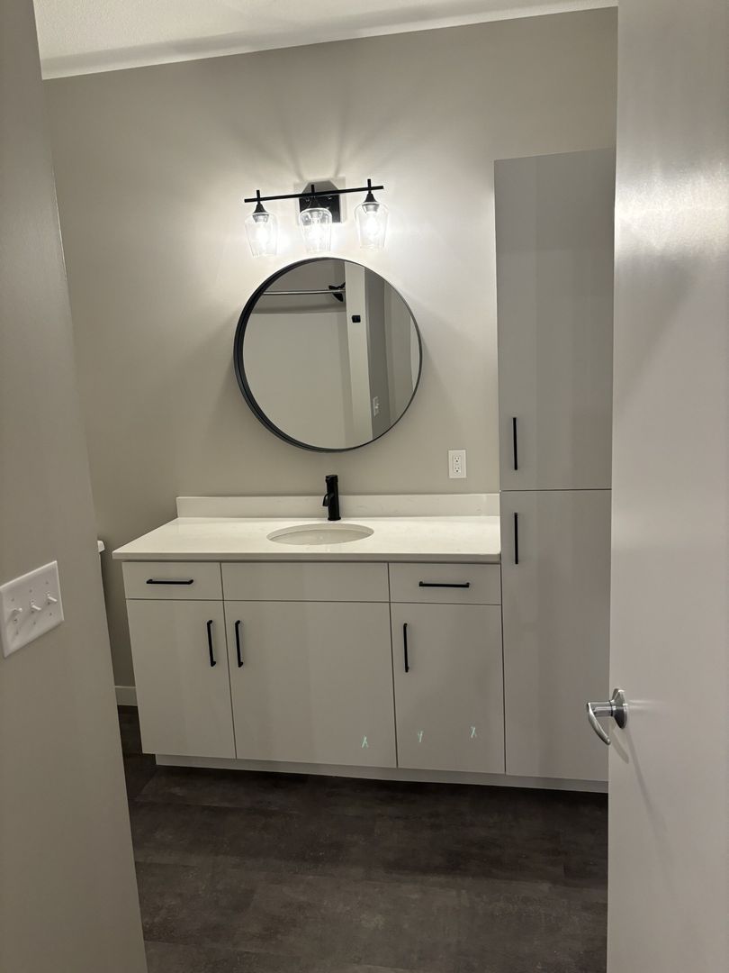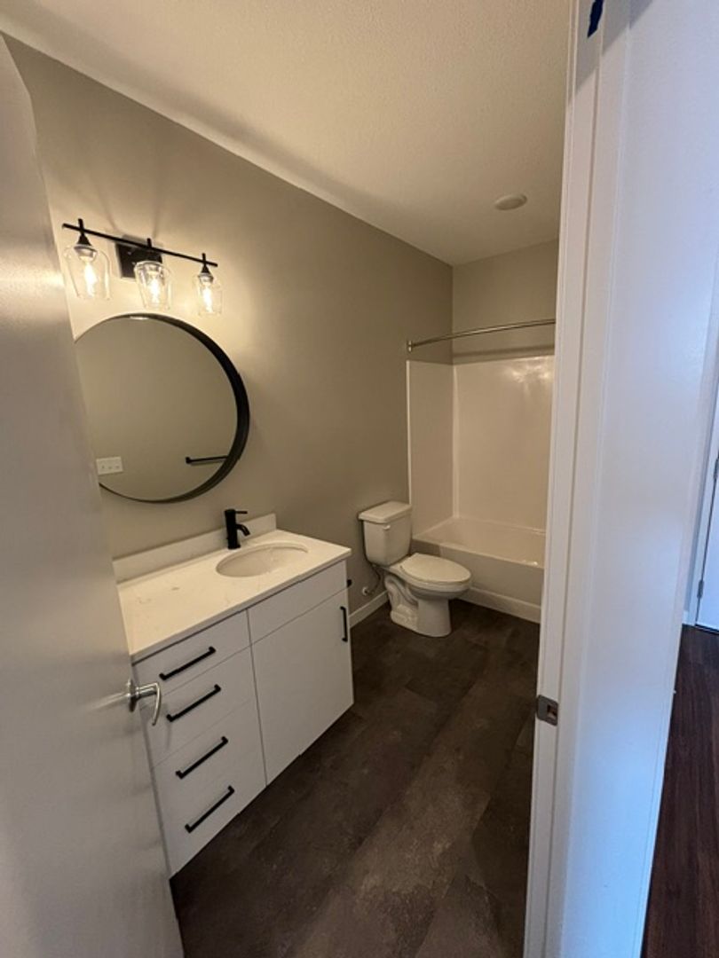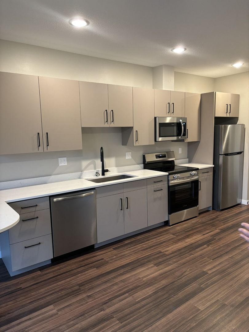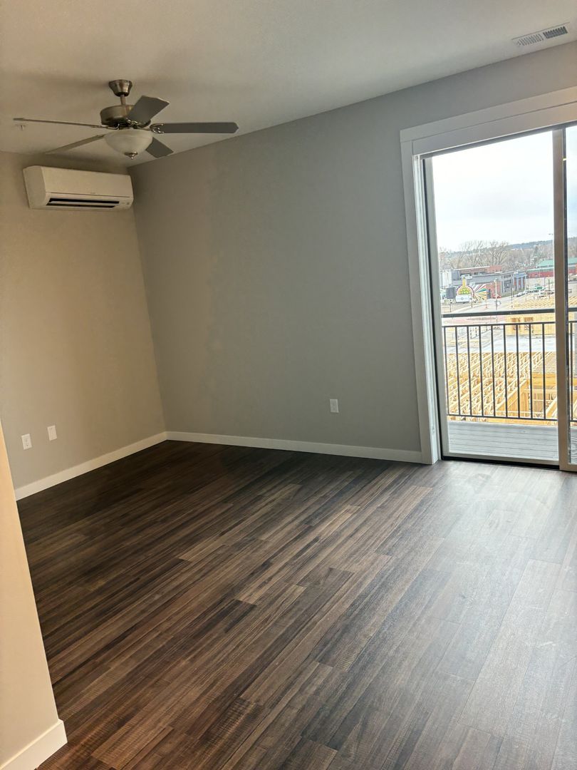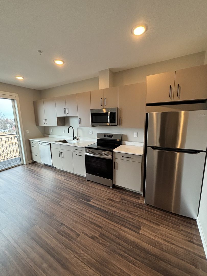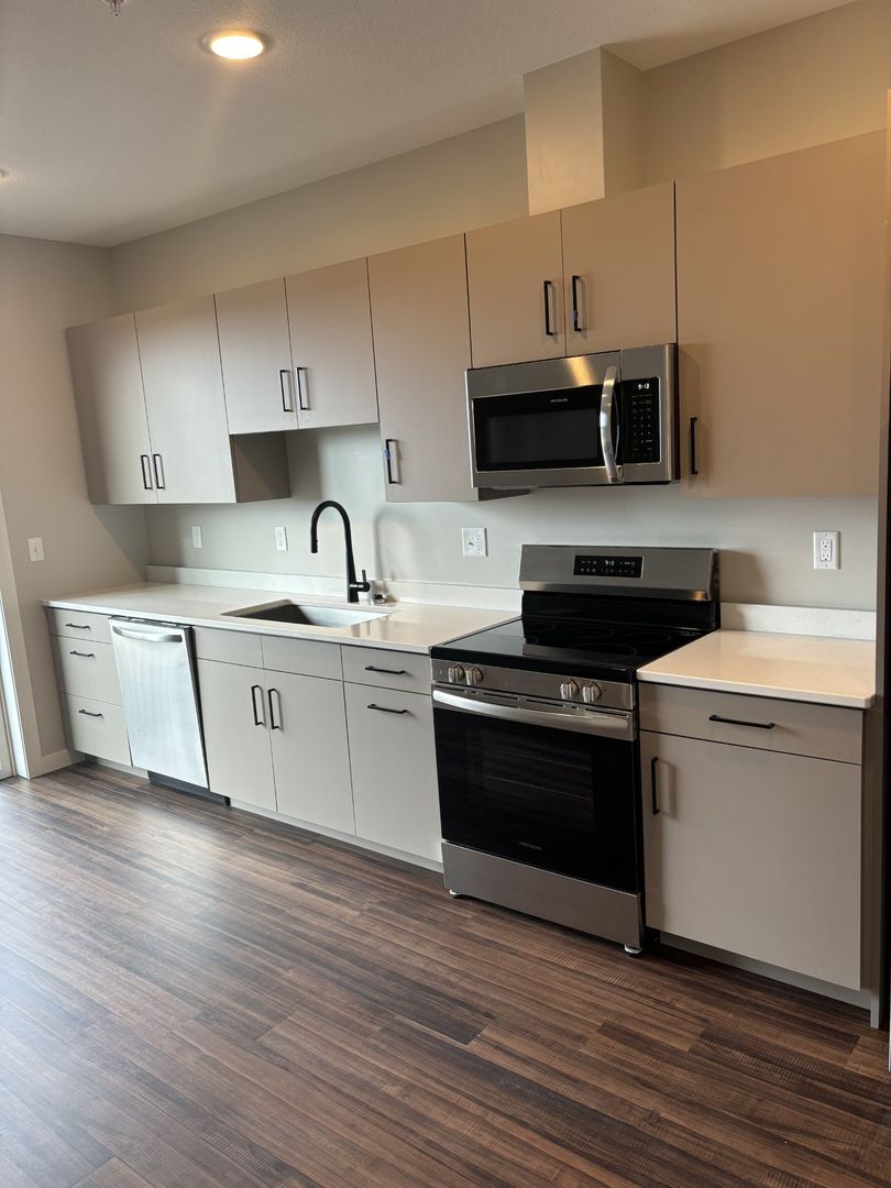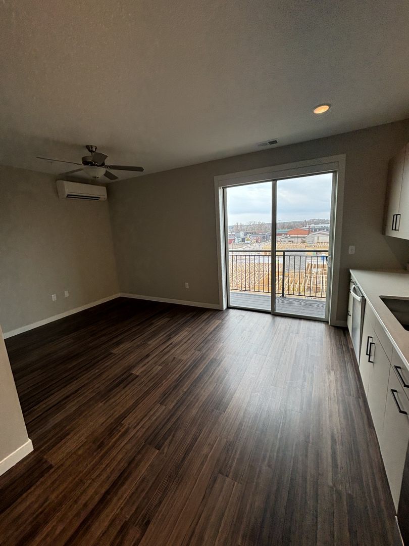 This studio apartment features a contemporary kitchen equipped with energy-efficient stainless-steel appliances, quartz countertops, and plenty of storage. The space is enhanced by laminate wood flooring, modern fixtures, a stackable washer and dryer, window coverings, a ceiling fan, a large closet, and a balcony. The unit listed is an affordable apartment based on 80% of the Area Median Income (AMI) and does have income restrictions.