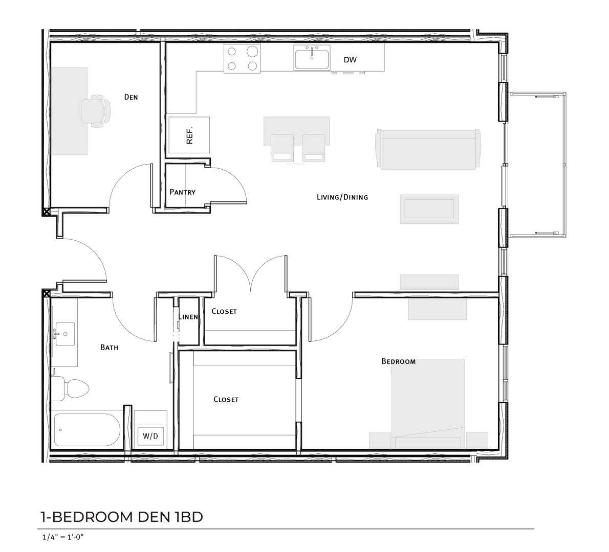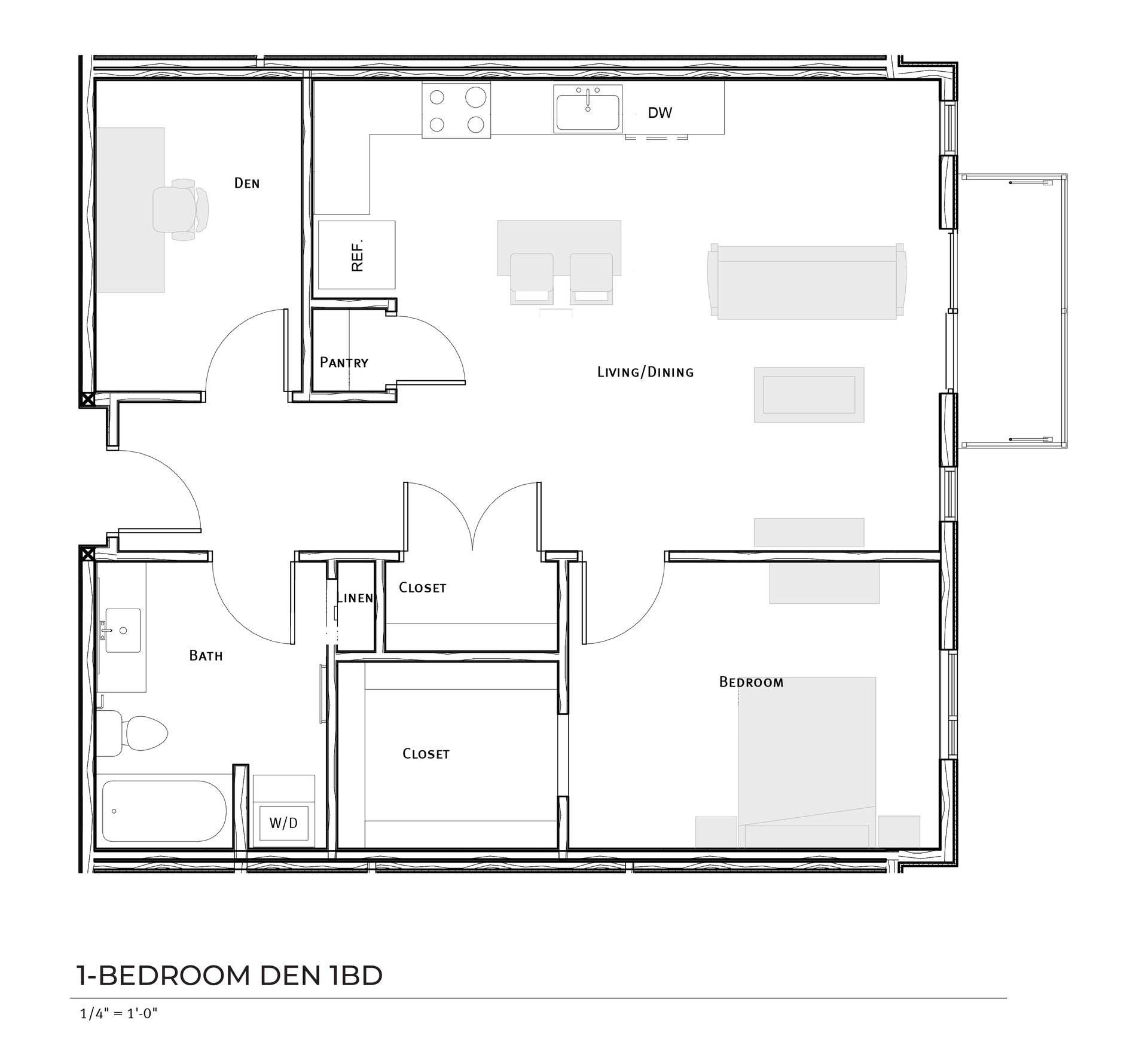 There is 1 floorplan in the 1-bedroom with a den style, Residents may choose to use the extra space as a home office, guest room or craft/gaming room.